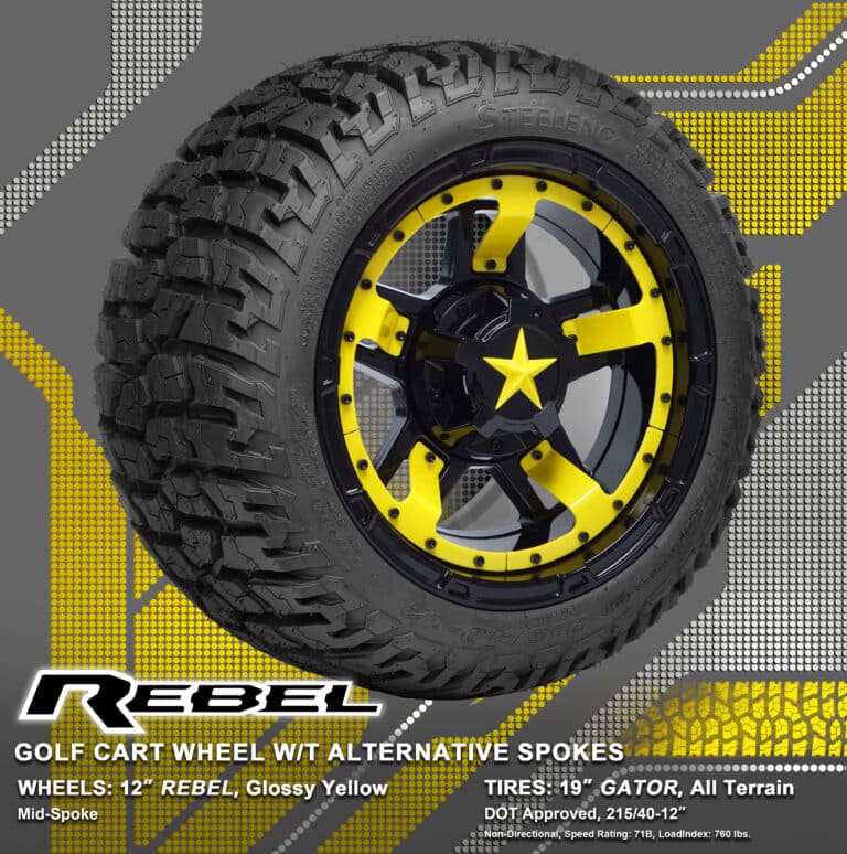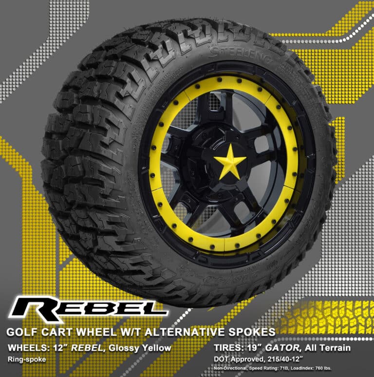 BNDL-TR1210-WH1251-WIRB24-LN0002 – SGC 12″ REBEL Glossy Black Wheel – Aluminum Alloy / STEELENG 215/40-12 GATOR Hybrid Low Profile / All Terrain Tire DOT Approved / All Terrain Tire DOT Approved / REBEL Inserts-Ring-Glossy Yellow