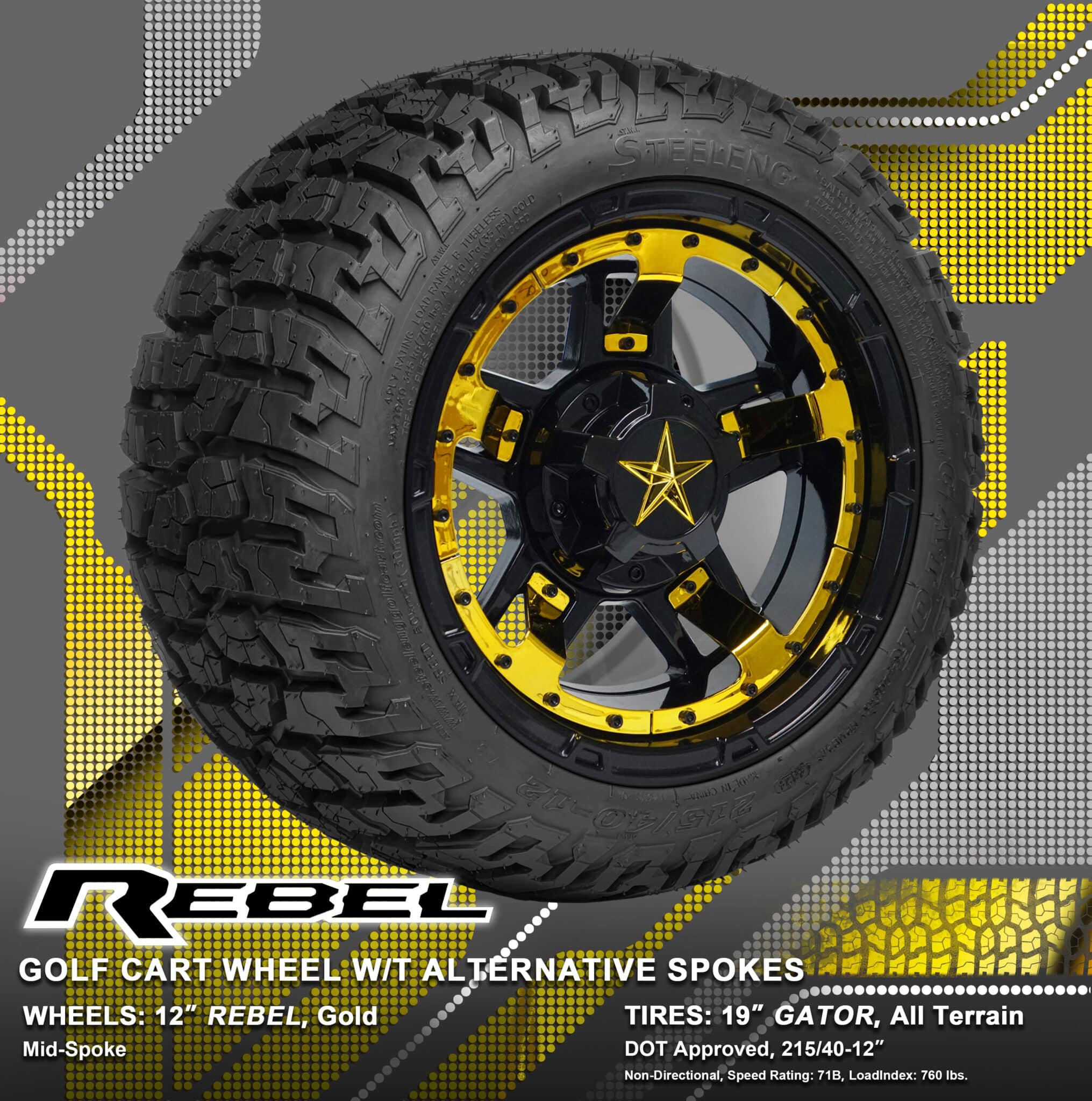 BNDL-TR1210-WH1251-WIRB12-LN0002 – SGC 12″ REBEL Glossy Black Wheel – Aluminum Alloy / STEELENG 215/40-12 GATOR Hybrid Low Profile / All Terrain Tire DOT Approved / REBEL Inserts-Mid Spoke-Gold