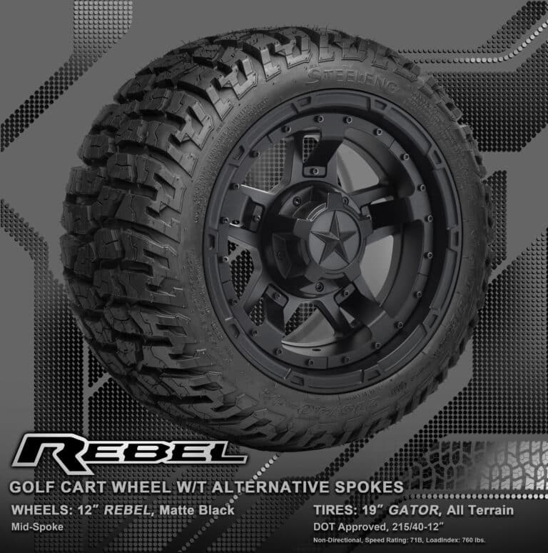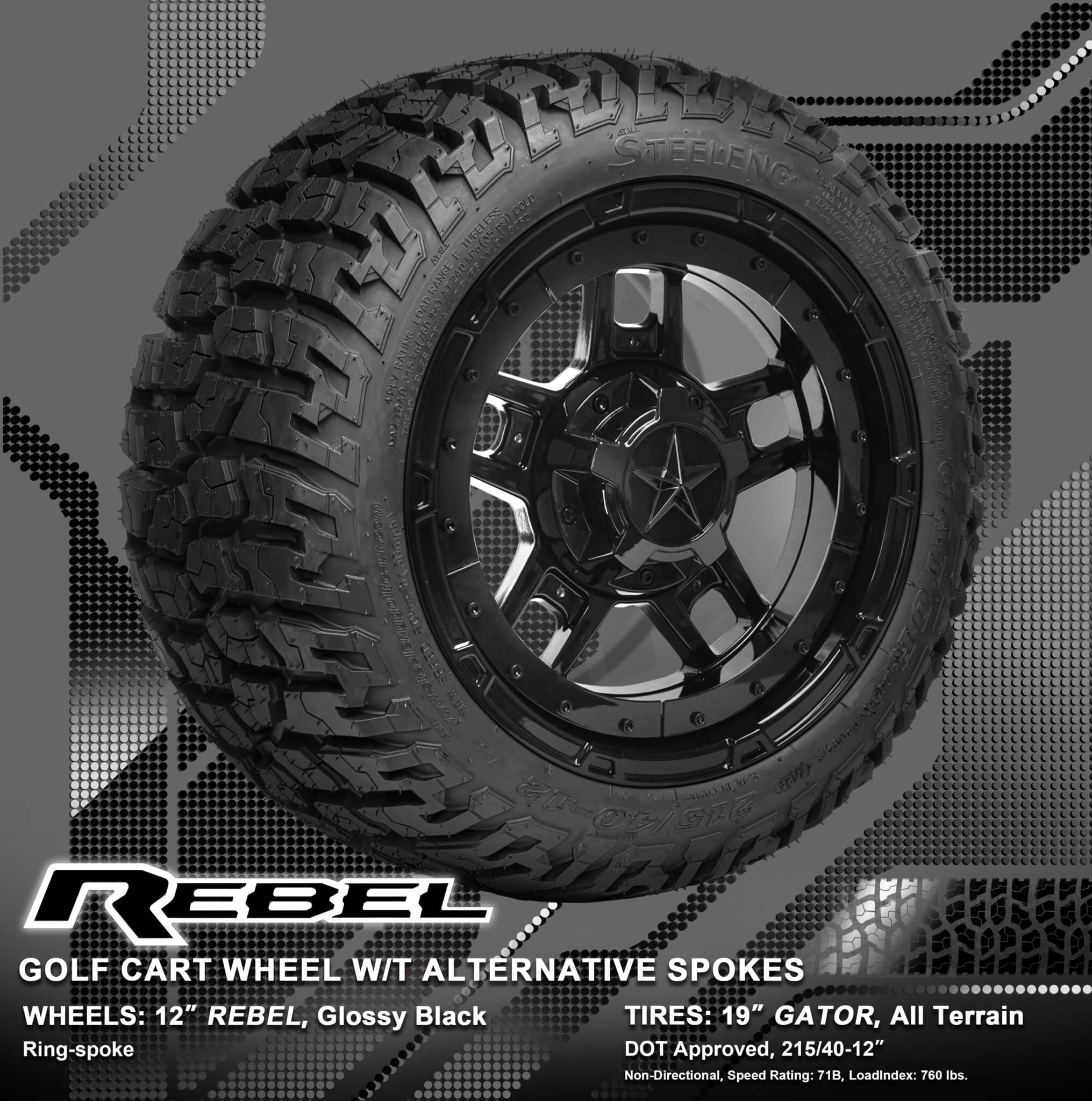 BNDL-TR1210-WH1251-WIRB13-LN0002 – SGC 12″ REBEL Glossy Black Wheel – Aluminum Alloy / STEELENG 215/40-12 GATOR Hybrid Low Profile / All Terrain Tire DOT Approved / REBEL Inserts-Mid Spoke-Matte Black