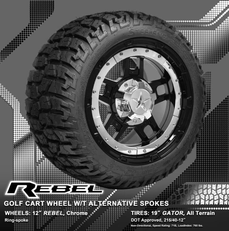 BNDL-TR1210-WH1251-WIRB15-LN0002 – SGC 12″ REBEL Glossy Black Wheel – Aluminum Alloy / STEELENG 215/40-12 GATOR Hybrid Low Profile / All Terrain Tire DOT Approved / REBEL Inserts-Ring-Chrome
