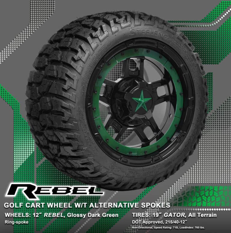 BNDL-TR1210-WH1251-WIRB18-LN0002 – SGC 12″ REBEL Glossy Black Wheel – Aluminum Alloy / STEELENG 215/40-12 GATOR Hybrid Low Profile / All Terrain Tire DOT Approved / REBEL Inserts-Ring-Glossy Dark Green