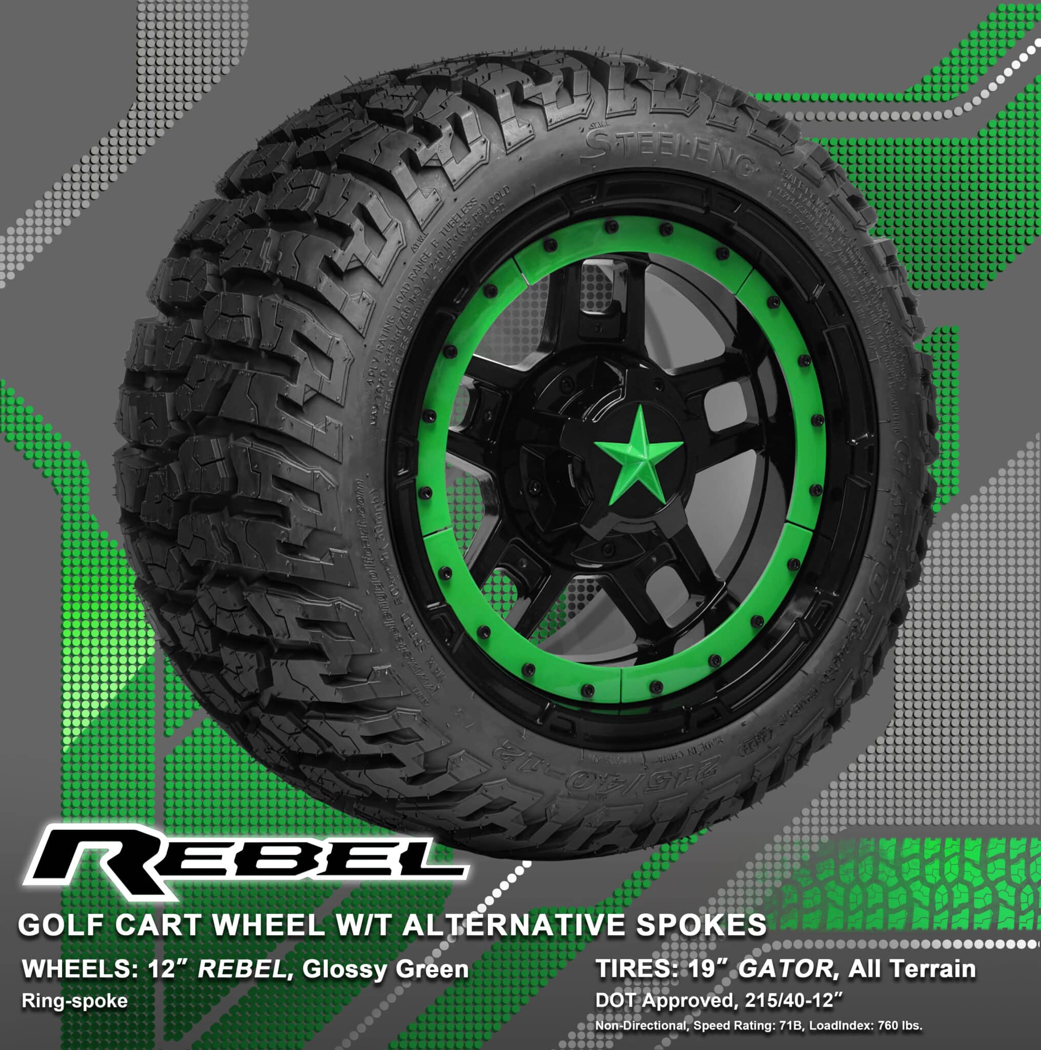 BNDL-TR1210-WH1251-WIRB19-LN0002 – SGC 12″ REBEL Glossy Black Wheel – Aluminum Alloy / STEELENG 215/40-12 GATOR Hybrid Low Profile / All Terrain Tire DOT Approved / REBEL Inserts-Ring-Glossy Green