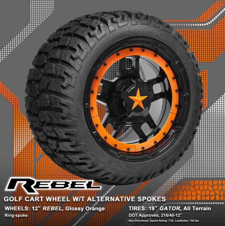 BNDL-TR1210-WH1251-WIRB20-LN0002 – SGC 12″ REBEL Glossy Black Wheel – Aluminum Alloy / STEELENG 215/40-12 GATOR Hybrid Low Profile / All Terrain Tire DOT Approved / REBEL Inserts-Ring-Glossy Orange