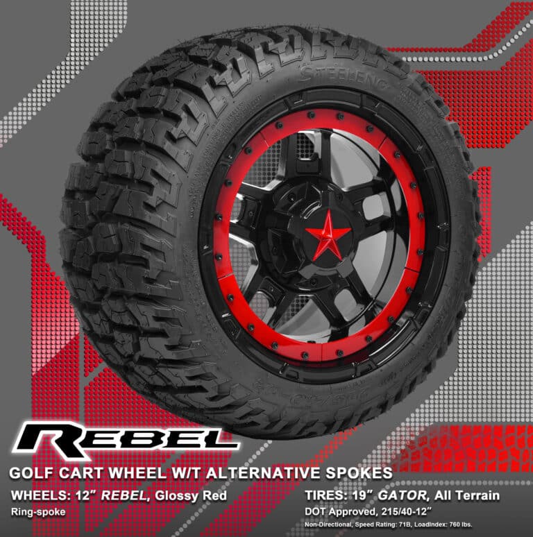 BNDL-TR1210-WH1251-WIRB21-LN0002 – SGC 12″ REBEL Glossy Black Wheel – Aluminum Alloy / STEELENG 215/40-12 GATOR Hybrid Low Profile / All Terrain Tire DOT Approved / REBEL Inserts-Ring-Glossy Red