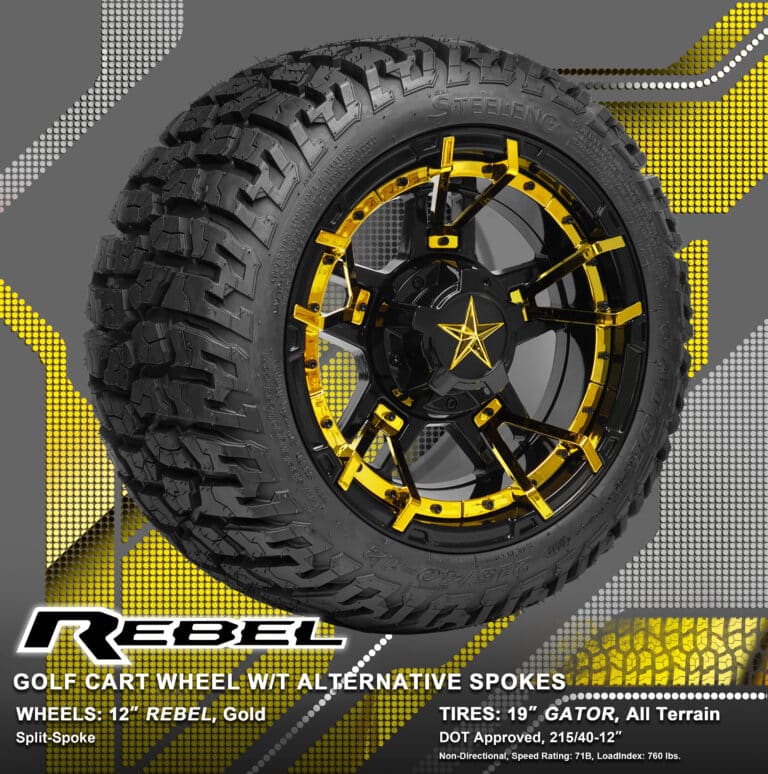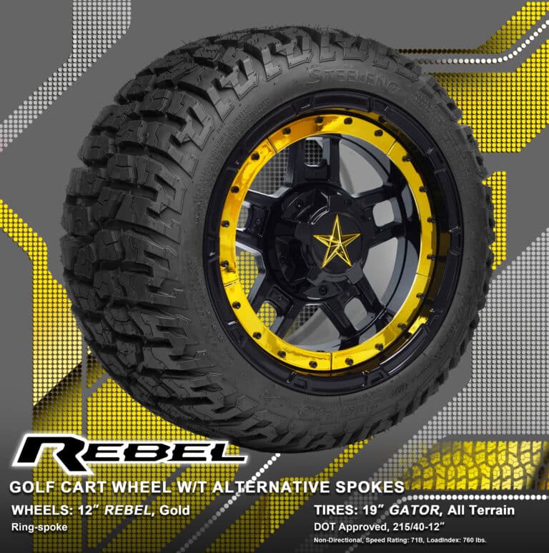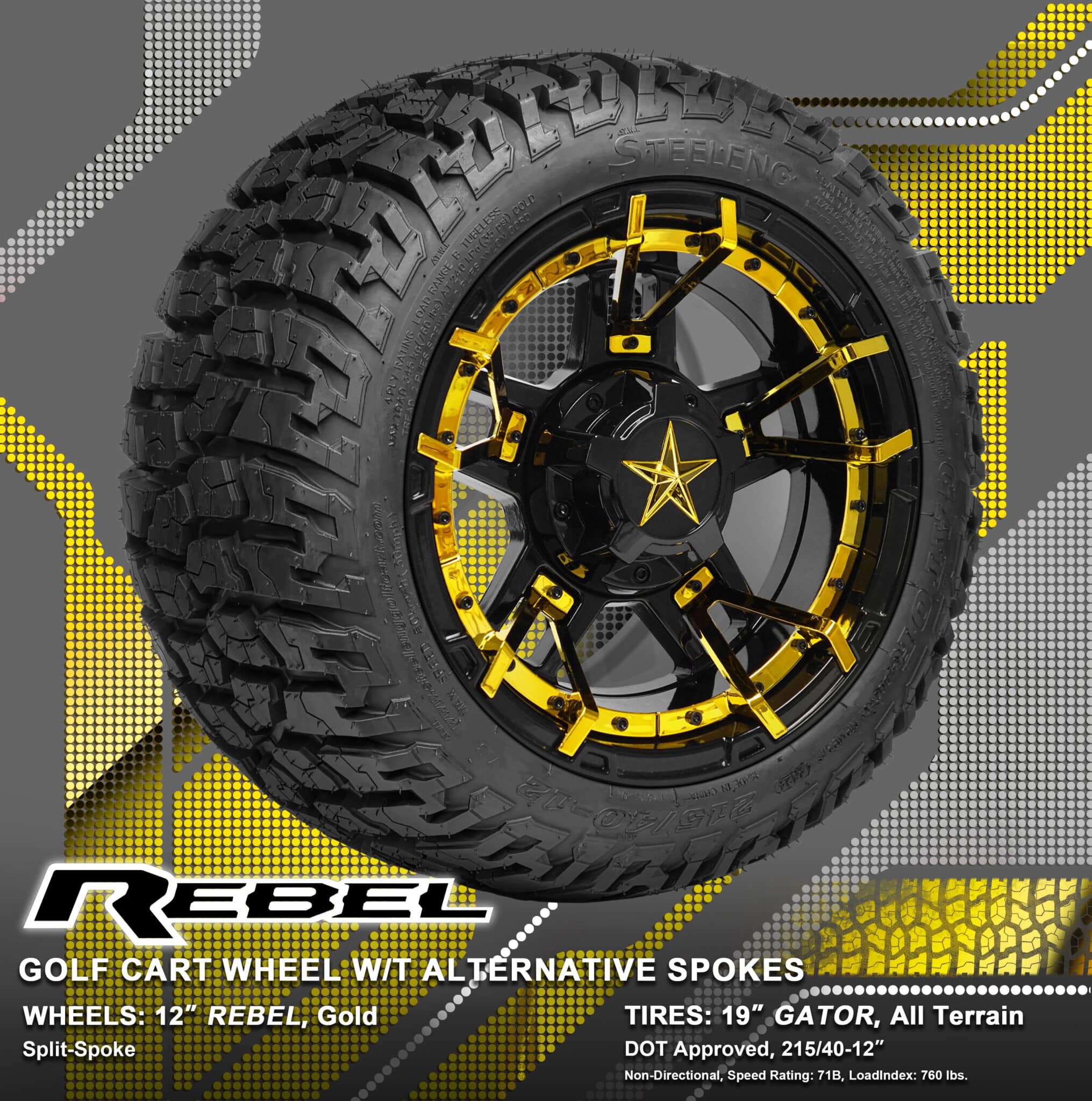 BNDL-TR1210-WH1251-WIRB38-LN0002 – SGC 12″ REBEL Glossy Black Wheel – Aluminum Alloy / STEELENG 215/40-12 GATOR Hybrid Low Profile / All Terrain Tire DOT Approved / REBEL Inserts-Split Spoke-Gold