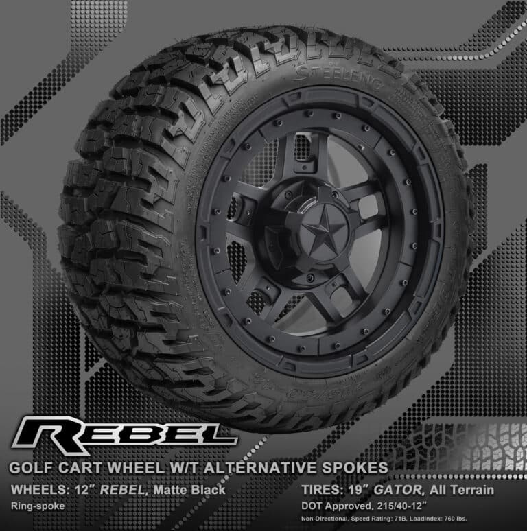BNDL-TR1210-WH1251-WIRB26-LN0002 – SGC 12″ REBEL Glossy Black Wheel – Aluminum Alloy / STEELENG 215/40-12 GATOR Hybrid Low Profile / All Terrain Tire DOT Approved / REBEL Inserts-Ring-Matte Black