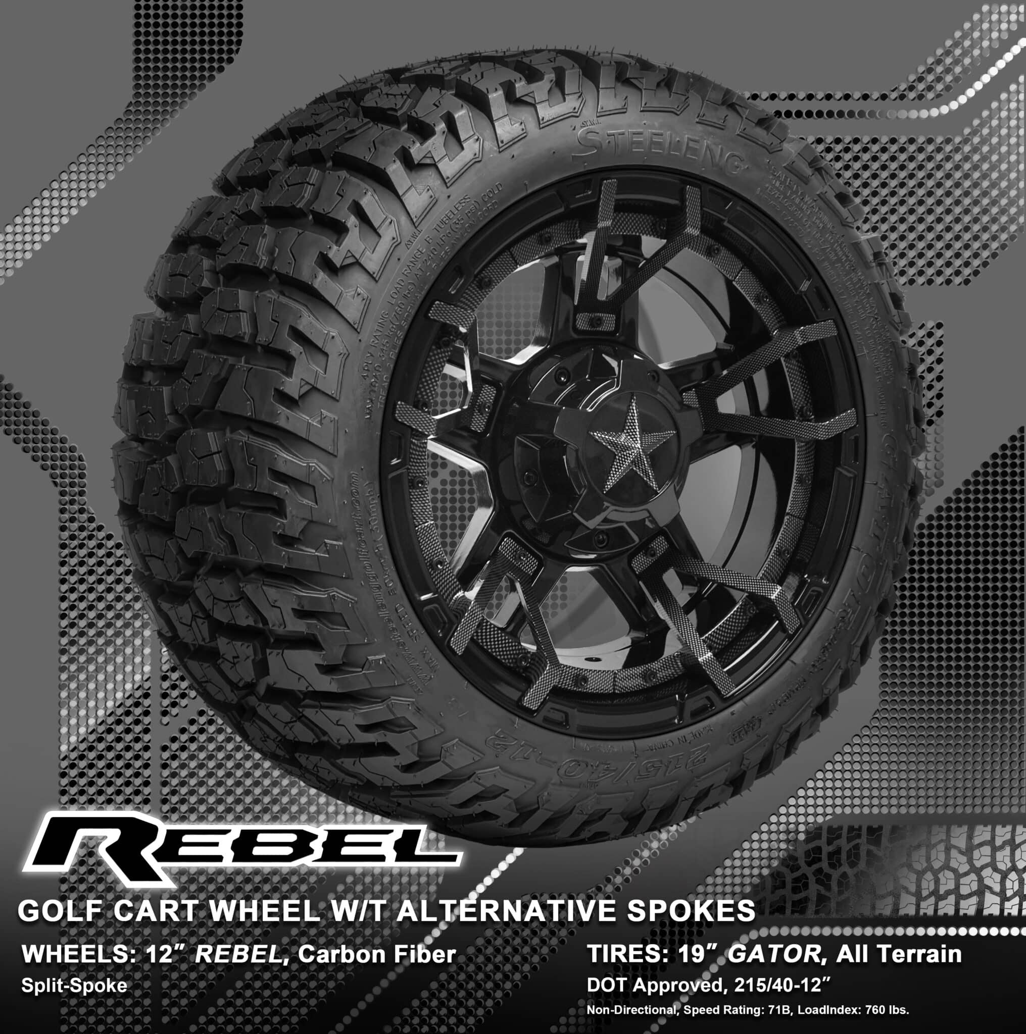 BNDL-TR1210-WH1251-WIRB27-LN0002 – SGC 12″ REBEL Glossy Black Wheel – Aluminum Alloy / STEELENG 215/40-12 GATOR Hybrid Low Profile / All Terrain Tire DOT Approved / REBEL Inserts-Split Spoke-Carbon Fiber