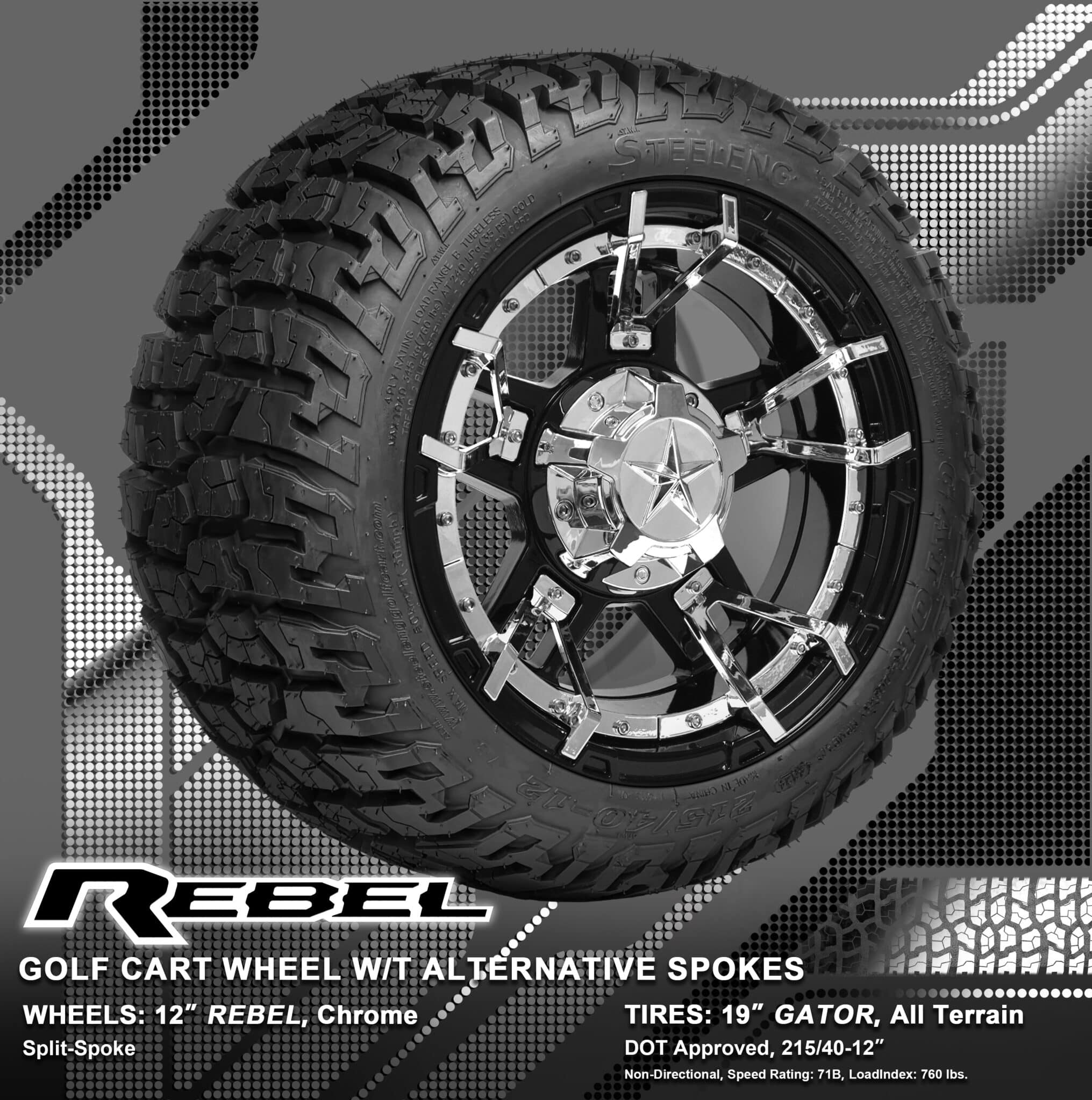 BNDL-TR1210-WH1251-WIRB28-LN0002 – SGC 12″ REBEL Glossy Black Wheel – Aluminum Alloy / STEELENG 215/40-12 GATOR Hybrid Low Profile / All Terrain Tire DOT Approved / REBEL Inserts-Split Spoke-Chrome