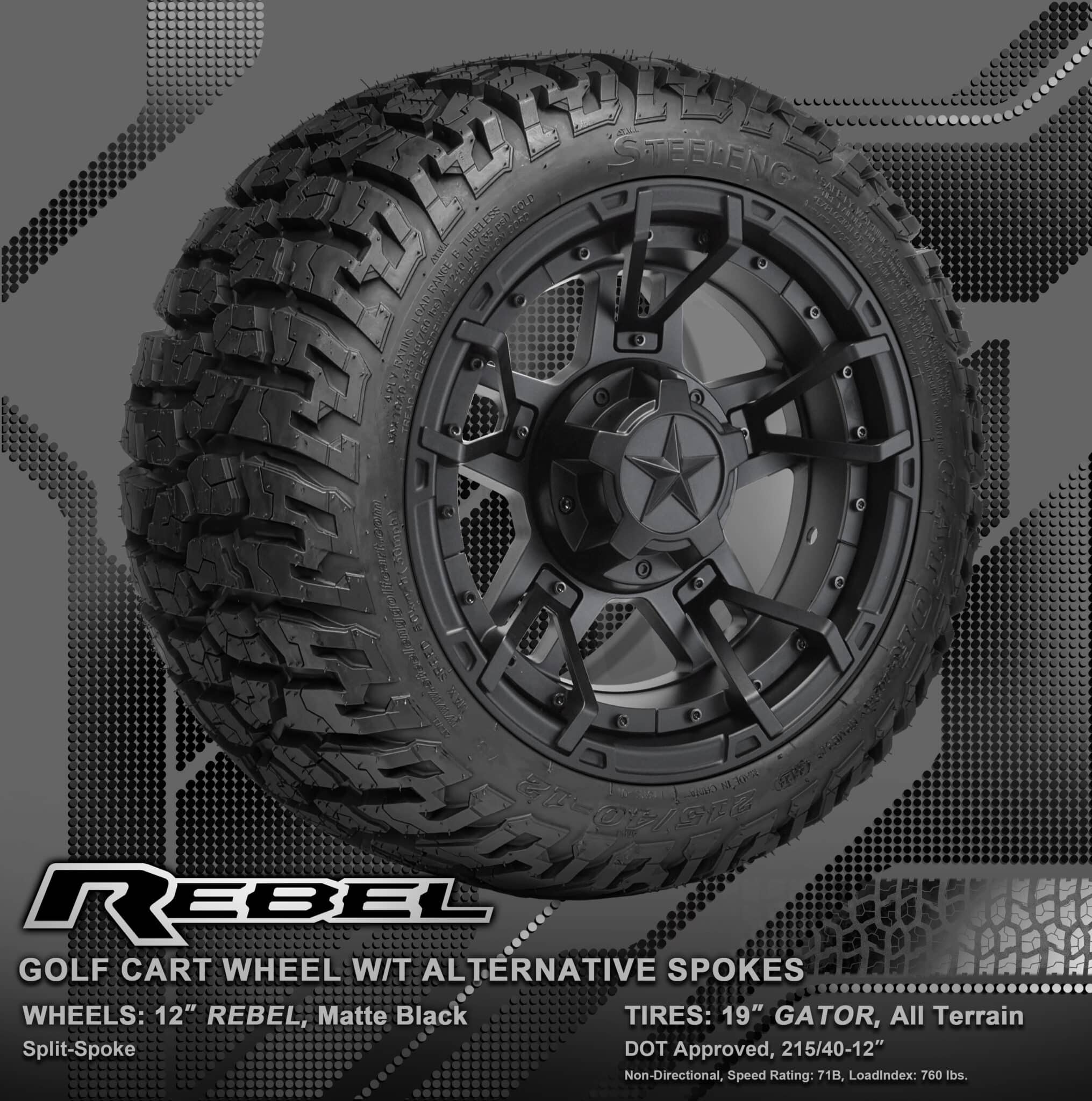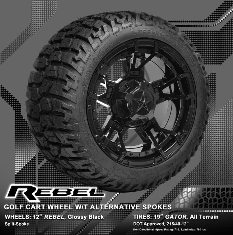 BNDL-TR1210-WH1251-WIRB39-LN0002 – SGC 12″ REBEL Glossy Black Wheel – Aluminum Alloy / STEELENG 215/40-12 GATOR Hybrid Low Profile / All Terrain Tire DOT Approved / REBEL Inserts-Split Spoke-Matte Black