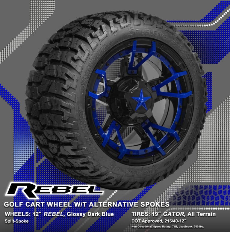 BNDL-TR1210-WH1251-WIRB30-LN0002 – SGC 12″ REBEL Glossy Black Wheel – Aluminum Alloy / STEELENG 215/40-12 GATOR Hybrid Low Profile / All Terrain Tire DOT Approved / REBEL Inserts-Split Spoke-Glossy Dark Blue
