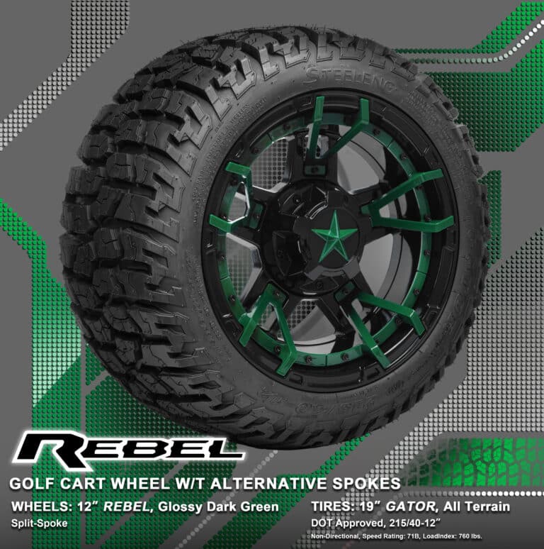 BNDL-TR1210-WH1251-WIRB31-LN0002 – SGC 12″ REBEL Glossy Black Wheel – Aluminum Alloy / STEELENG 215/40-12 GATOR Hybrid Low Profile / All Terrain Tire DOT Approved / REBEL Inserts-Split Spoke-Glossy Dark Green