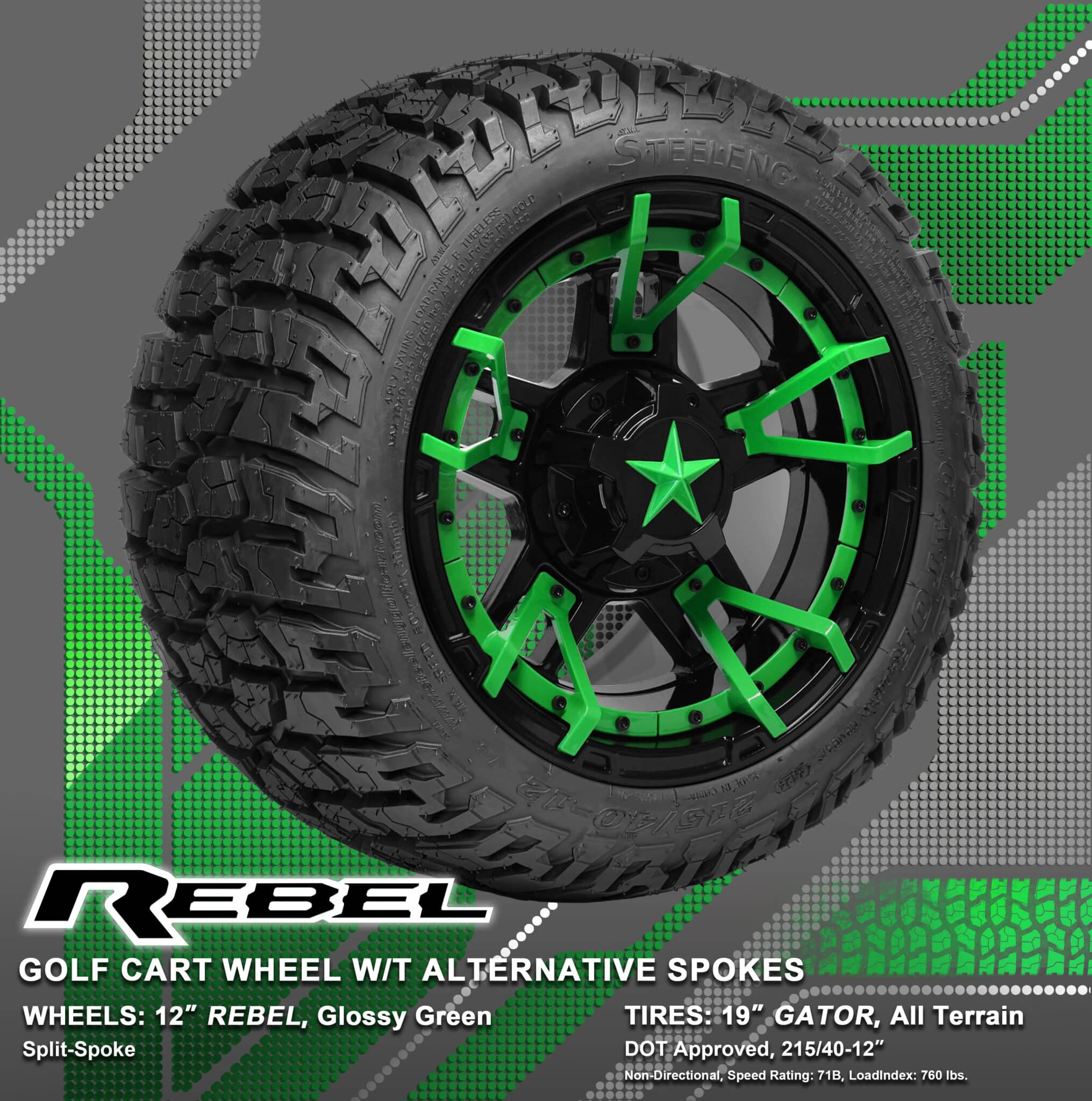 BNDL-TR1210-WH1251-WIRB32-LN0002 – SGC 12″ REBEL Glossy Black Wheel – Aluminum Alloy / STEELENG 215/40-12 GATOR Hybrid Low Profile / All Terrain Tire DOT Approved / REBEL Inserts-Split Spoke-Glossy Green