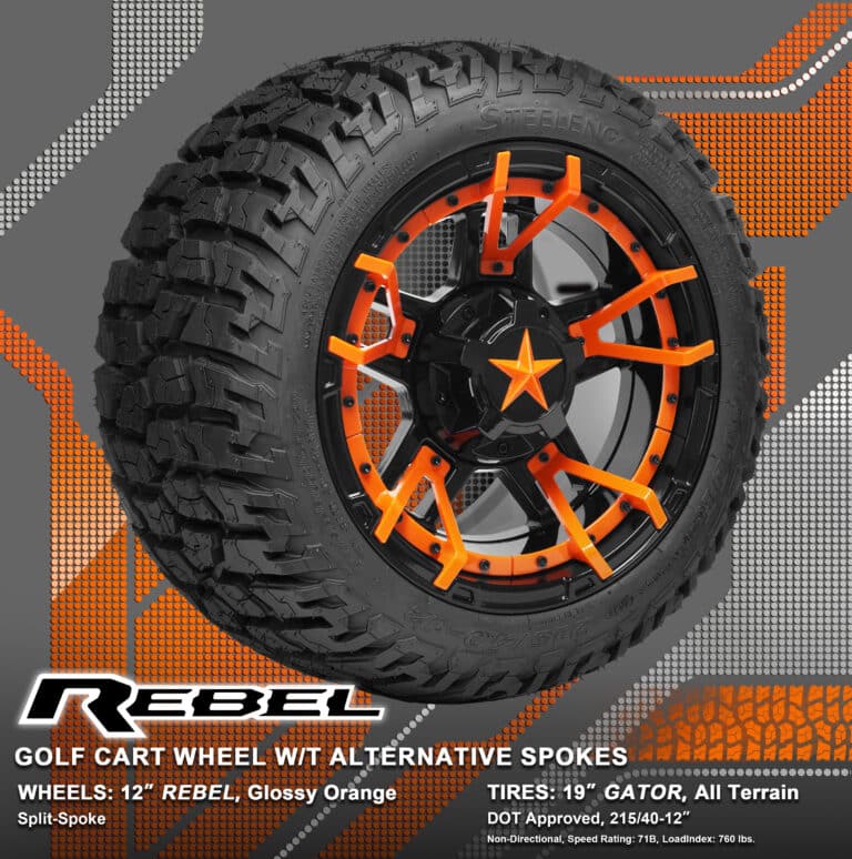 BNDL-TR1210-WH1251-WIRB33-LN0002 – SGC 12″ REBEL Glossy Black Wheel – Aluminum Alloy / STEELENG 215/40-12 GATOR Hybrid Low Profile / All Terrain Tire DOT Approved / REBEL Inserts-Split Spoke-Glossy Orange