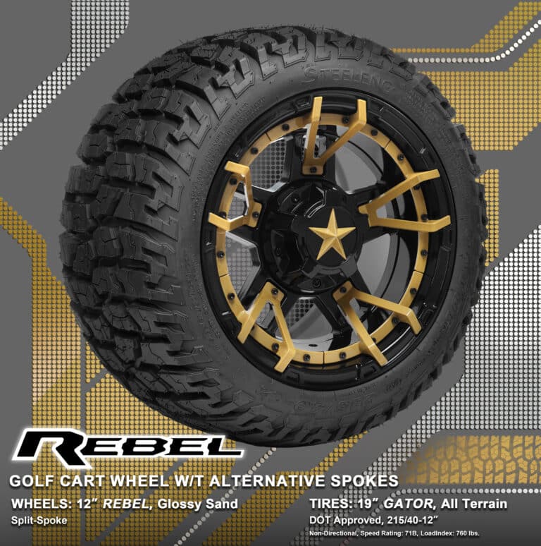 BNDL-TR1210-WH1251-WIRB35-LN0002 – SGC 12″ REBEL Glossy Black Wheel – Aluminum Alloy / STEELENG 215/40-12 GATOR Hybrid Low Profile / All Terrain Tire DOT Approved / REBEL Inserts-Split Spoke-Glossy Sand