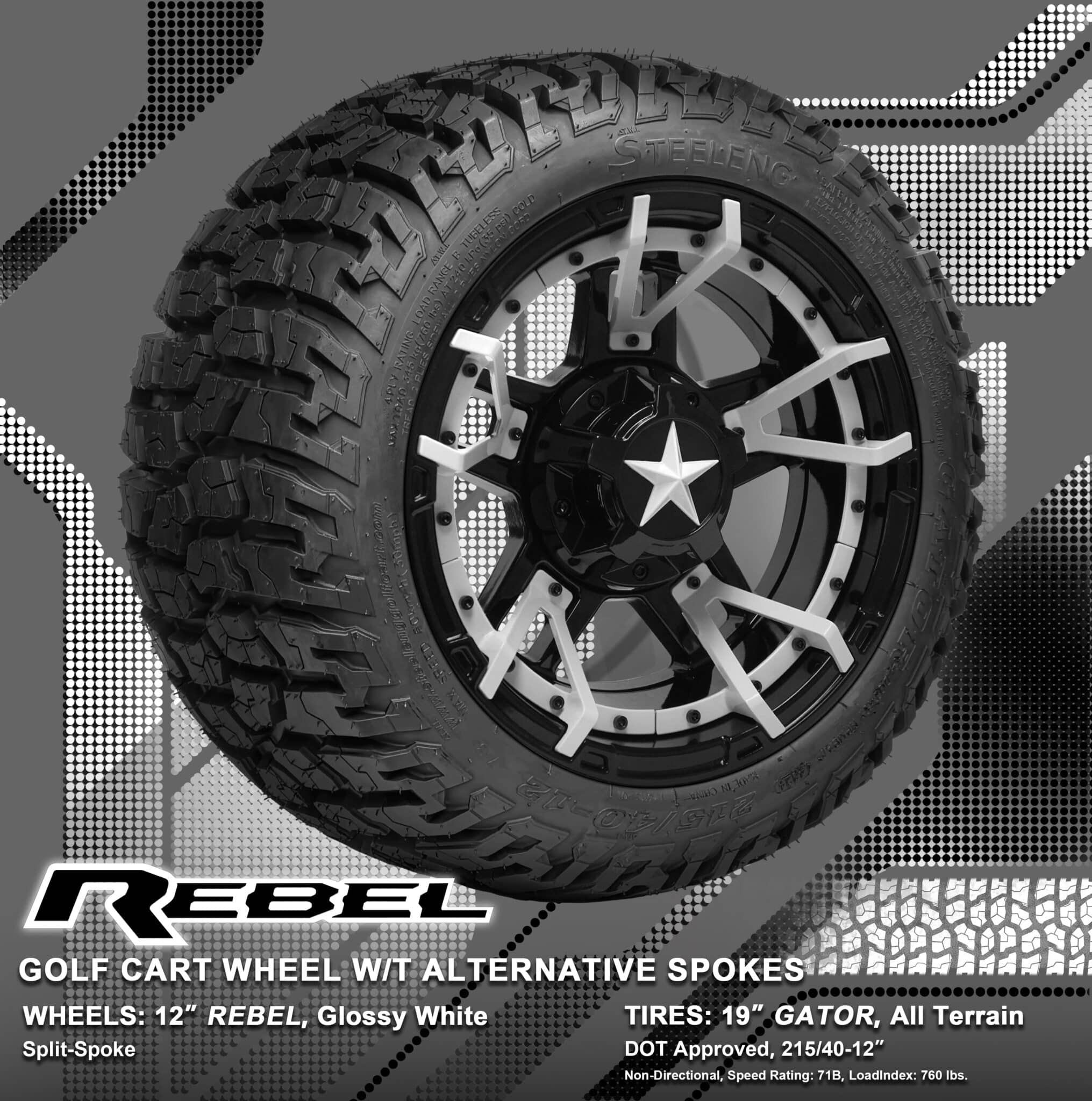 BNDL-TR1210-WH1251-WIRB36-LN0002 – SGC 12″ REBEL Glossy Black Wheel – Aluminum Alloy / STEELENG 215/40-12 GATOR Hybrid Low Profile / All Terrain Tire DOT Approved / REBEL Inserts-Split Spoke-Glossy White