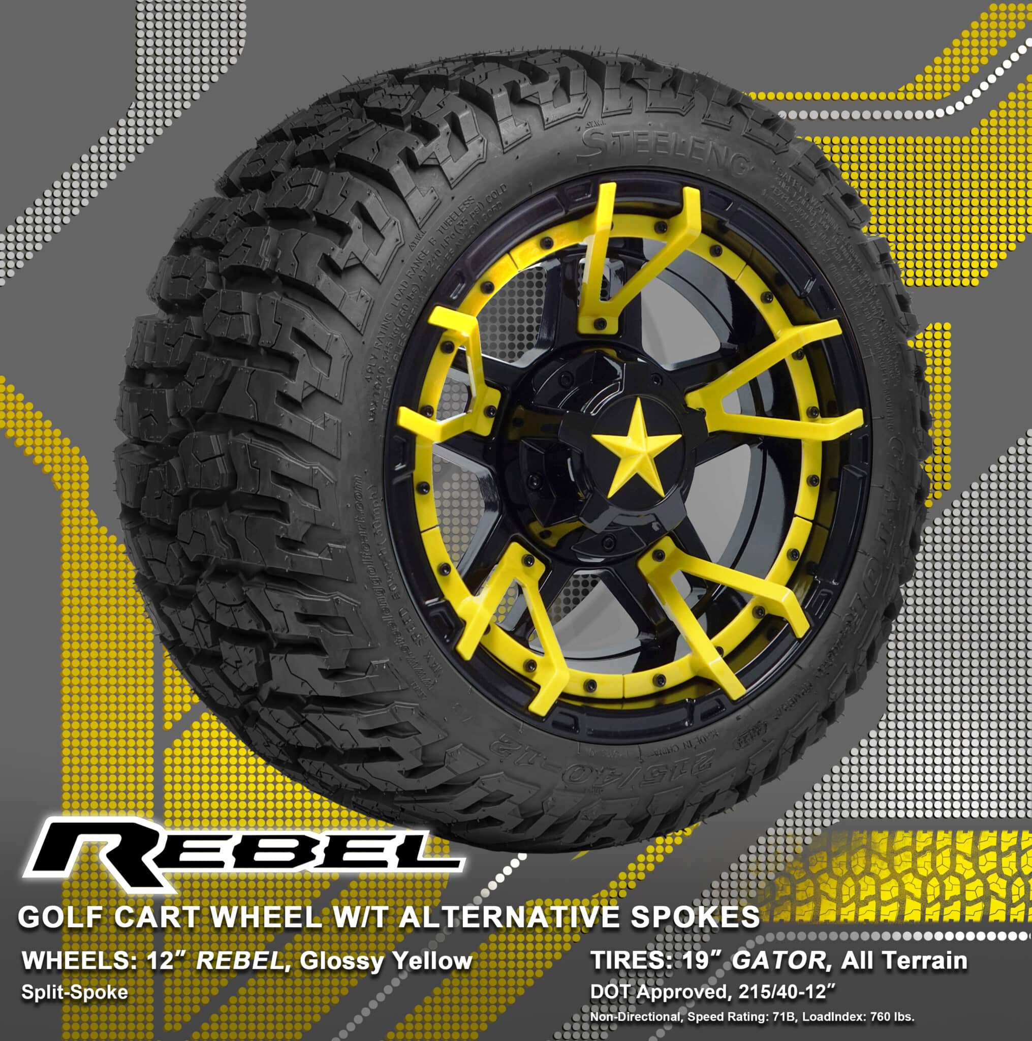 BNDL-TR1210-WH1251-WIRB37-LN0002 – SGC 12″ REBEL Glossy Black Wheel – Aluminum Alloy / STEELENG 215/40-12 GATOR Hybrid Low Profile / All Terrain Tire DOT Approved / REBEL Inserts-Split Spoke-Glossy Yellow