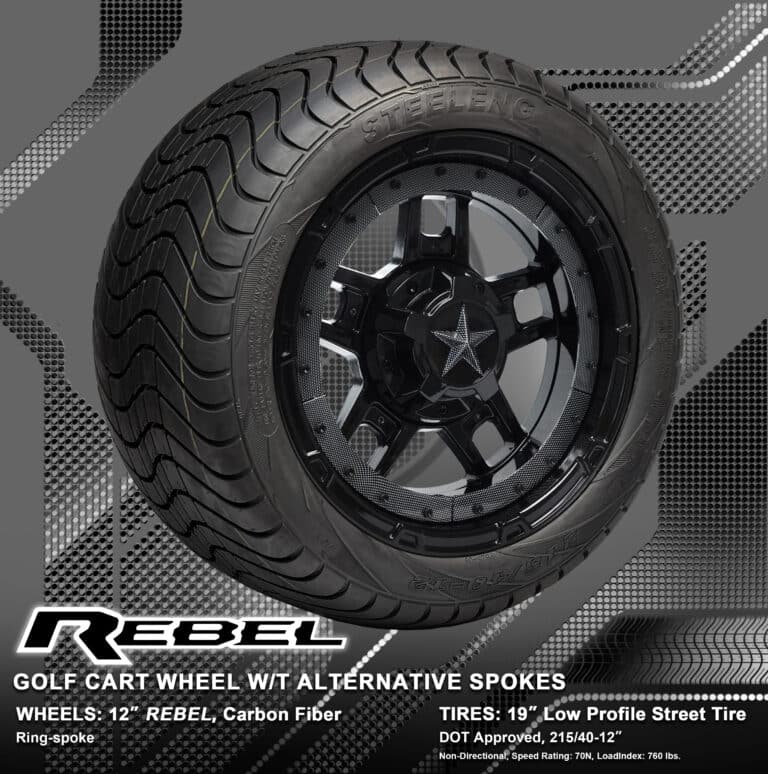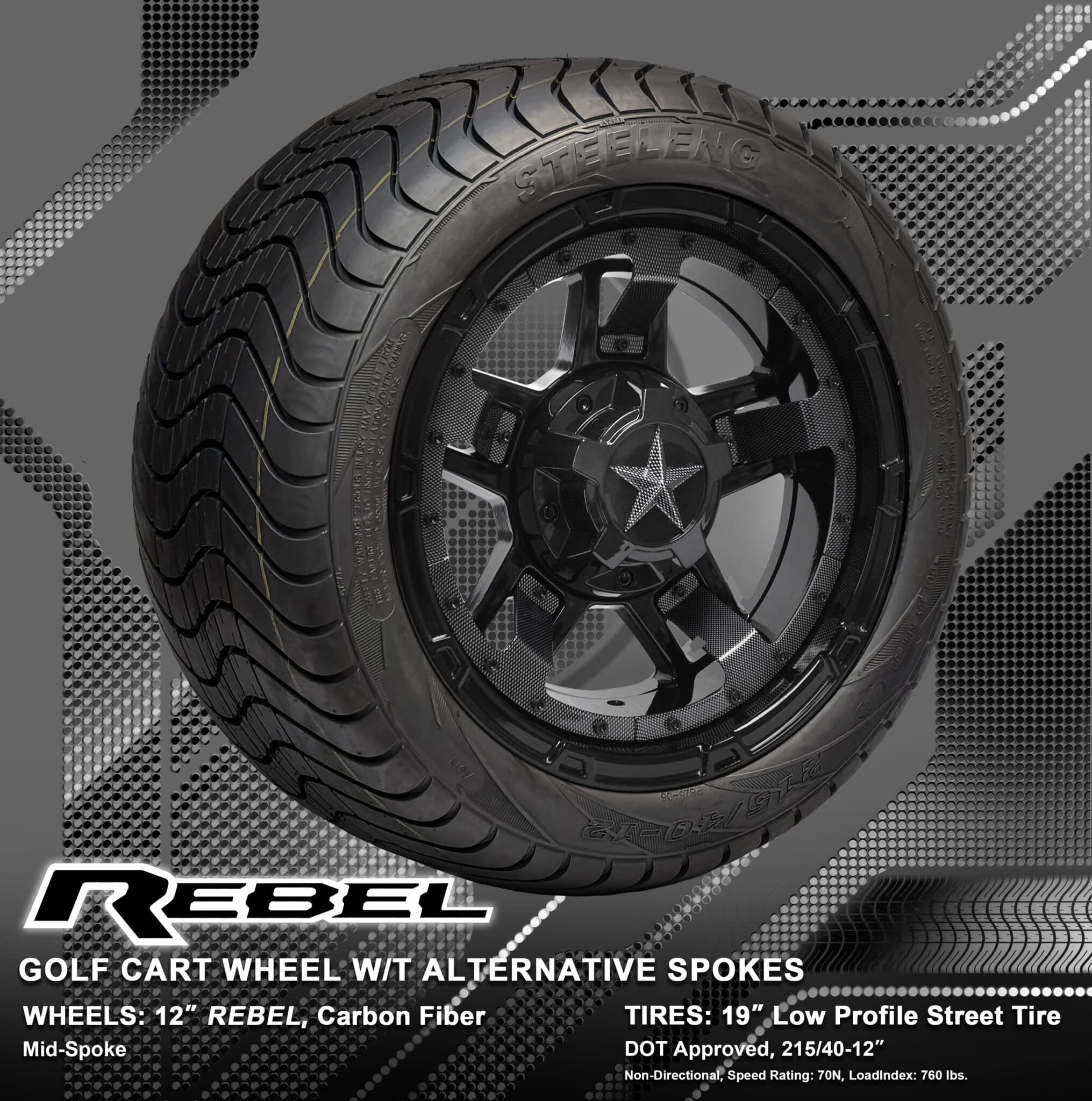 BNDL-TR1211-WH1251-WIRB01-LN0002 – SGC 12″ REBEL Glossy Black Wheel – Aluminum Alloy / STEELENG 215/40-12 Low Profile Tire DOT Approved / REBEL Inserts-Mid Spoke-Carbon Fiber