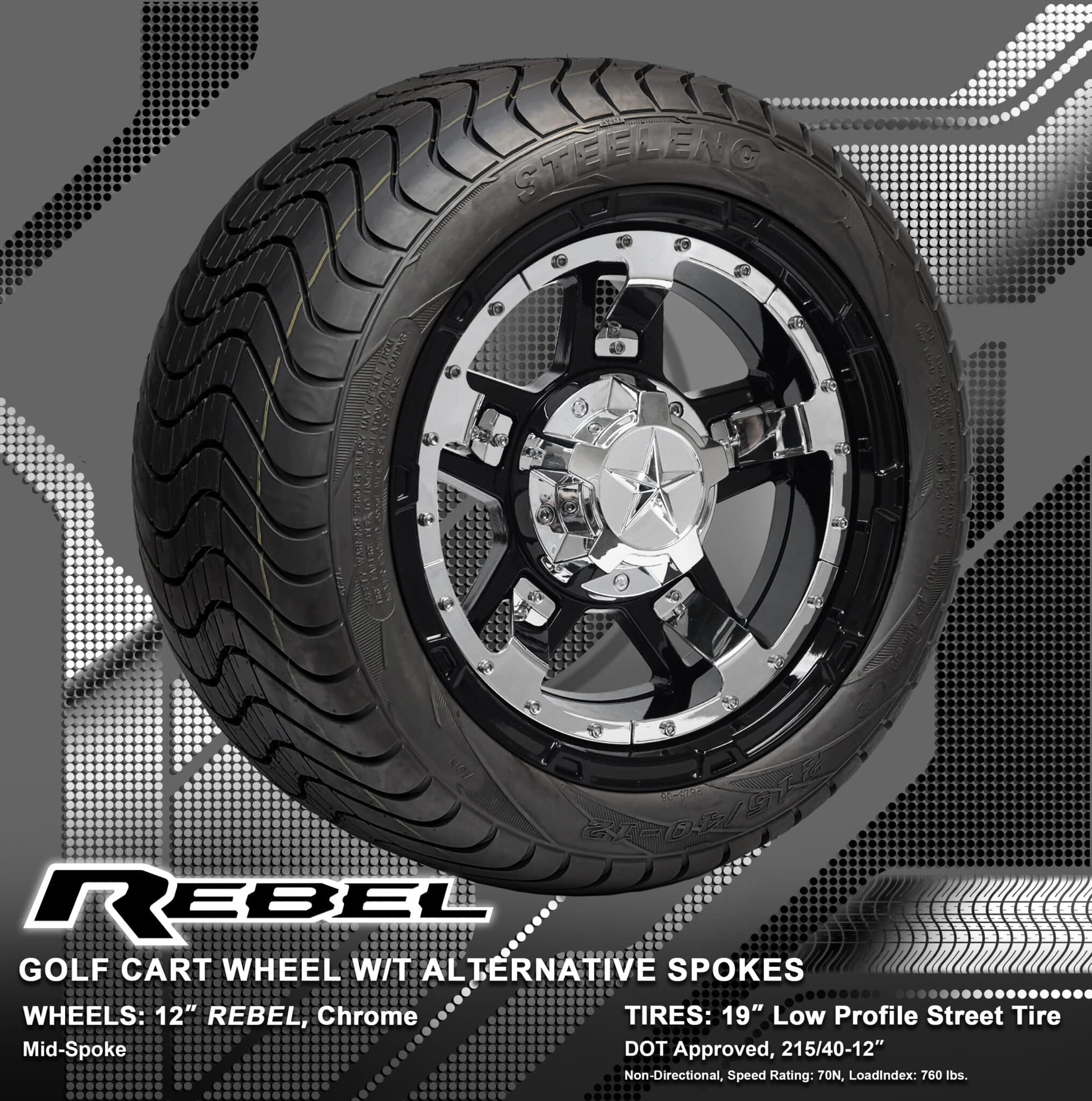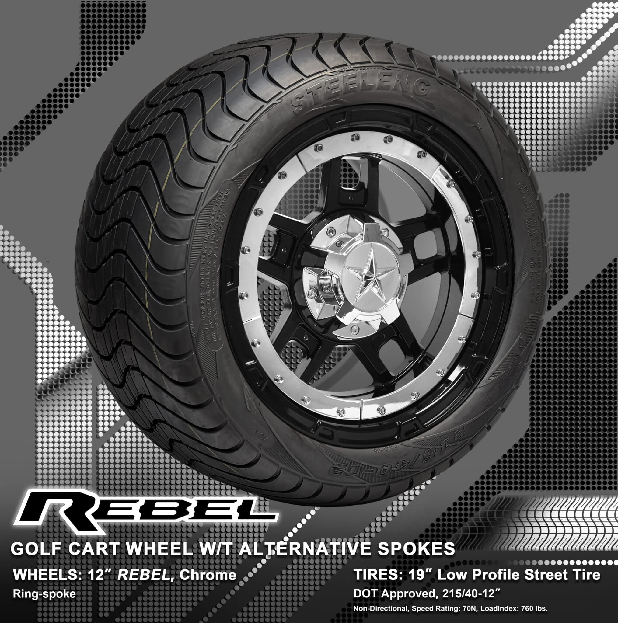 BNDL-TR1211-WH1251-WIRB02-LN0002 – SGC 12″ REBEL Glossy Black Wheel – Aluminum Alloy / STEELENG 215/40-12 Low Profile Tire DOT Approved / REBEL Inserts-Mid Spoke-Chrome