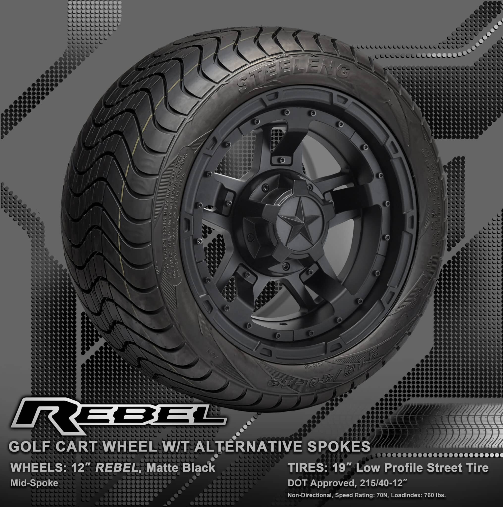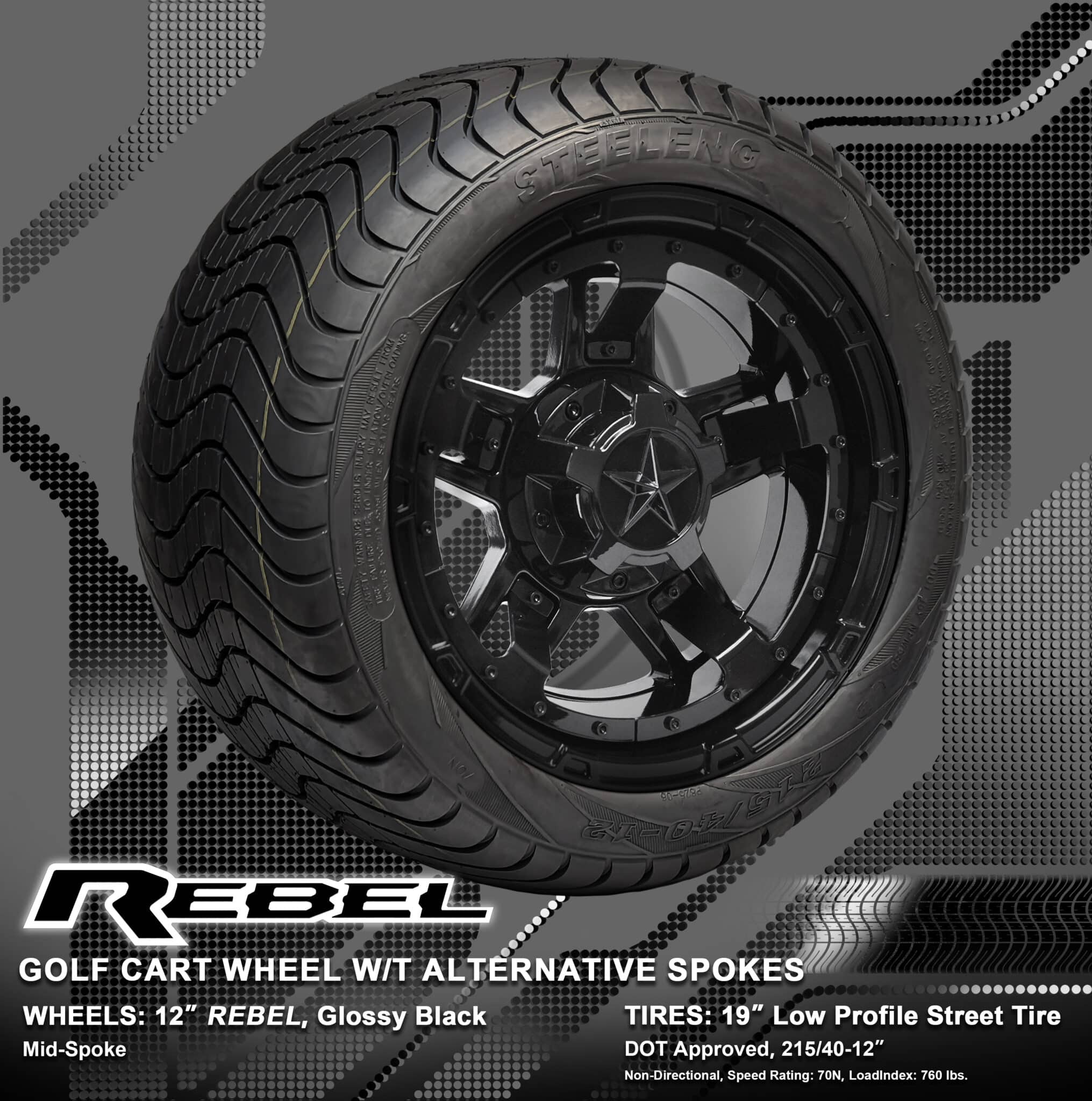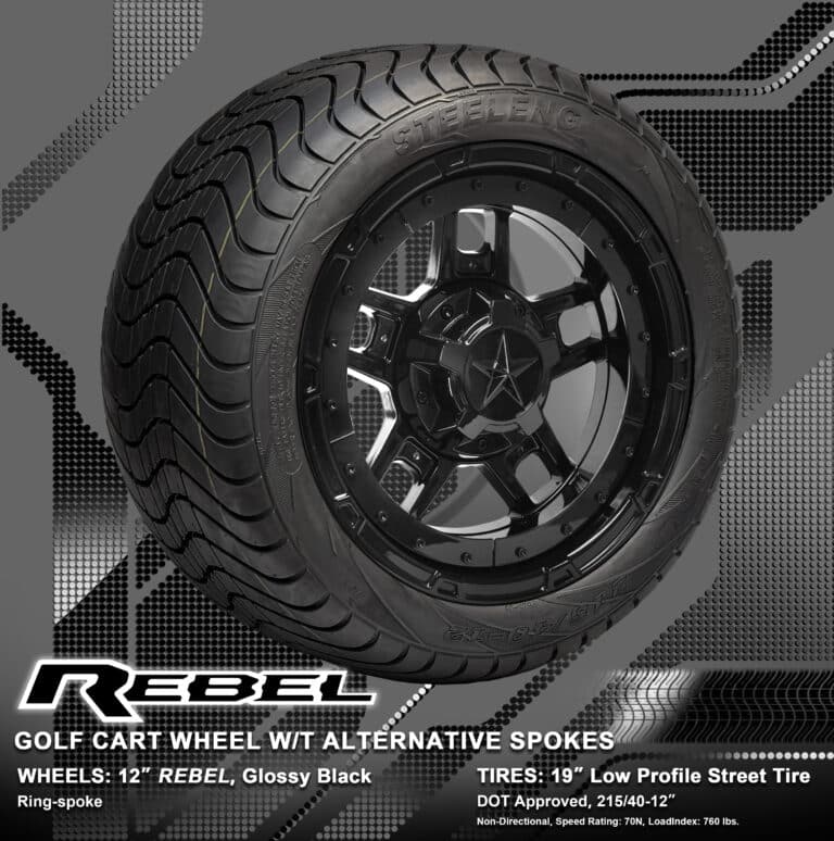 BNDL-TR1211-WH1251-WIRB13-LN0002 – SGC 12″ REBEL Glossy Black Wheel – Aluminum Alloy / STEELENG 215/40-12 Low Profile Tire DOT Approved / REBEL Inserts-Mid Spoke-Matte Black