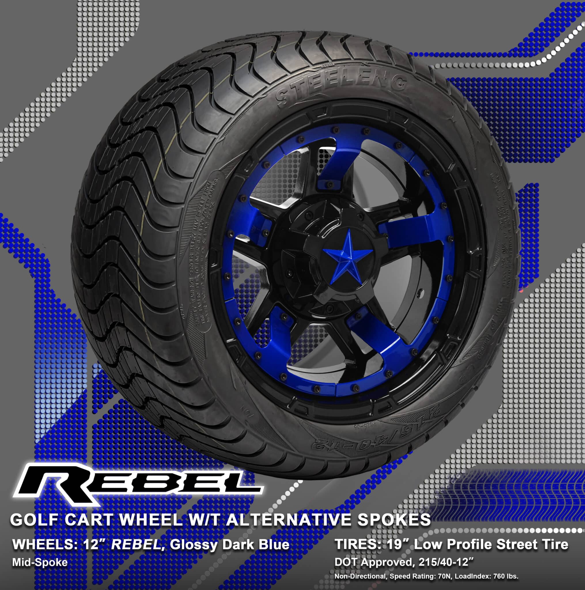 BNDL-TR1211-WH1251-WIRB04-LN0002 – SGC 12″ REBEL Glossy Black Wheel – Aluminum Alloy / STEELENG 215/40-12 Low Profile Tire DOT Approved / REBEL Inserts-Mid Spoke-Glossy Dark Blue