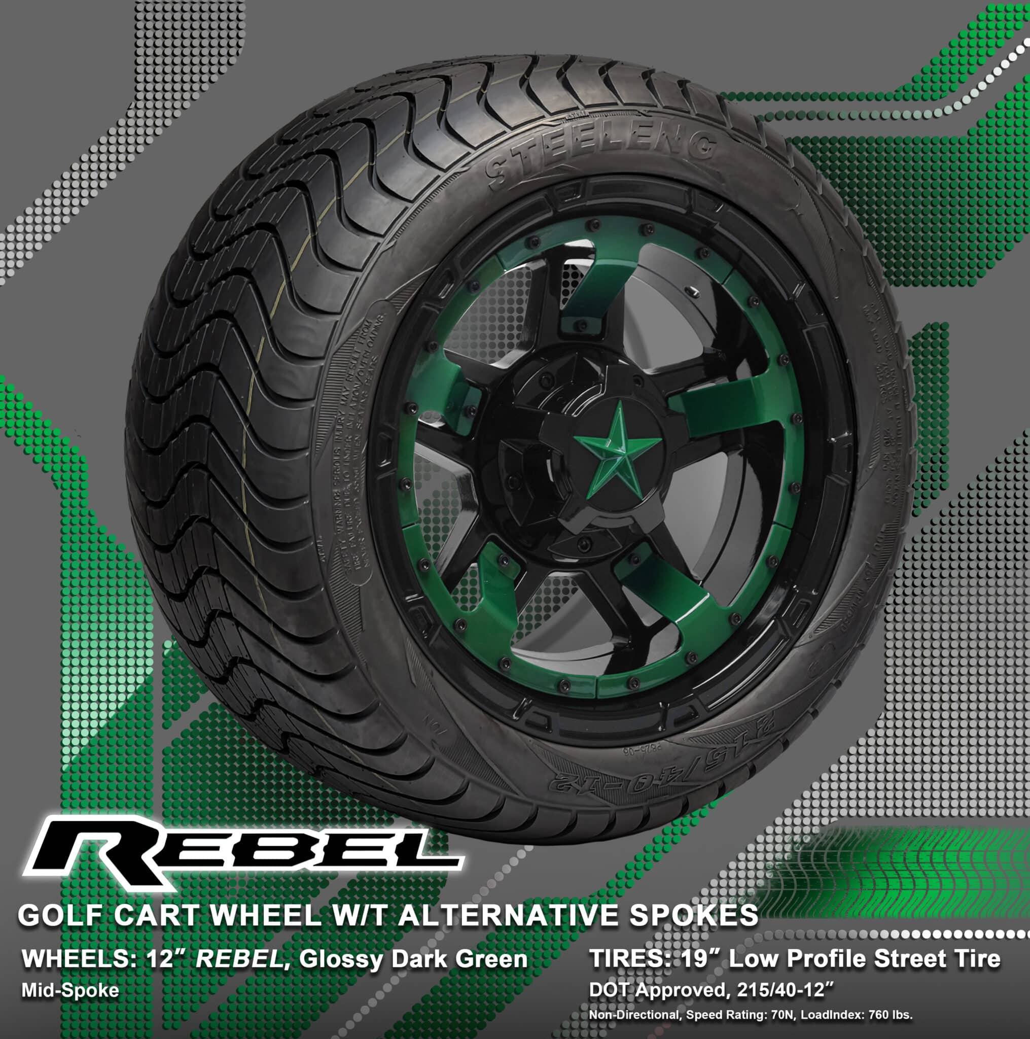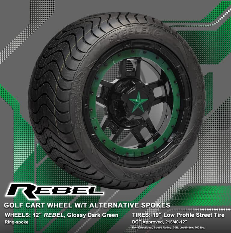 BNDL-TR1211-WH1251-WIRB05-LN0002 – SGC 12″ REBEL Glossy Black Wheel – Aluminum Alloy / STEELENG 215/40-12 Low Profile Tire DOT Approved / REBEL Inserts-Mid Spoke-Glossy Dark Green