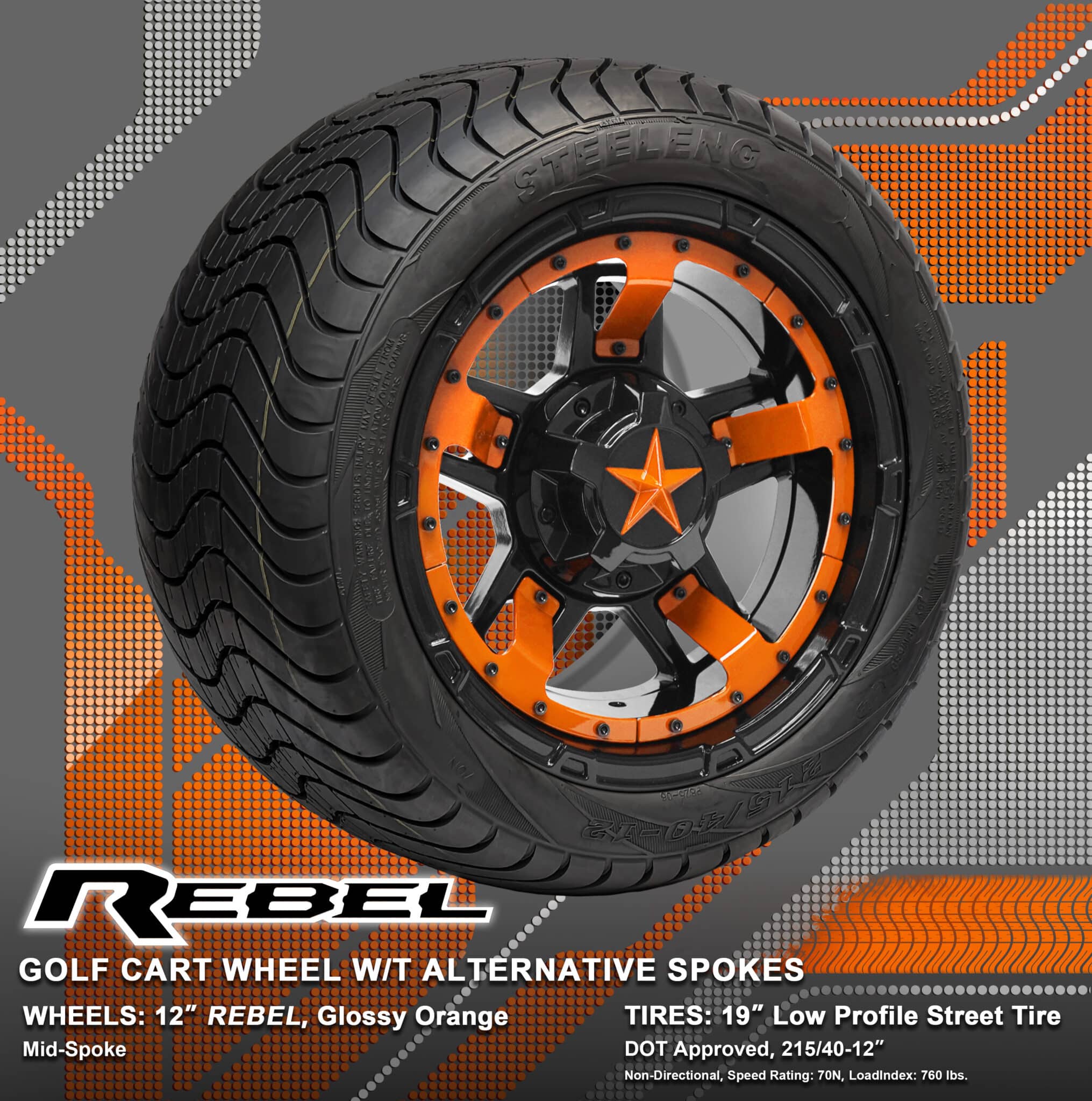 BNDL-TR1211-WH1251-WIRB07-LN0002 – SGC 12″ REBEL Glossy Black Wheel – Aluminum Alloy / STEELENG 215/40-12 Low Profile Tire DOT Approved / REBEL Inserts-Mid Spoke-Glossy Orange