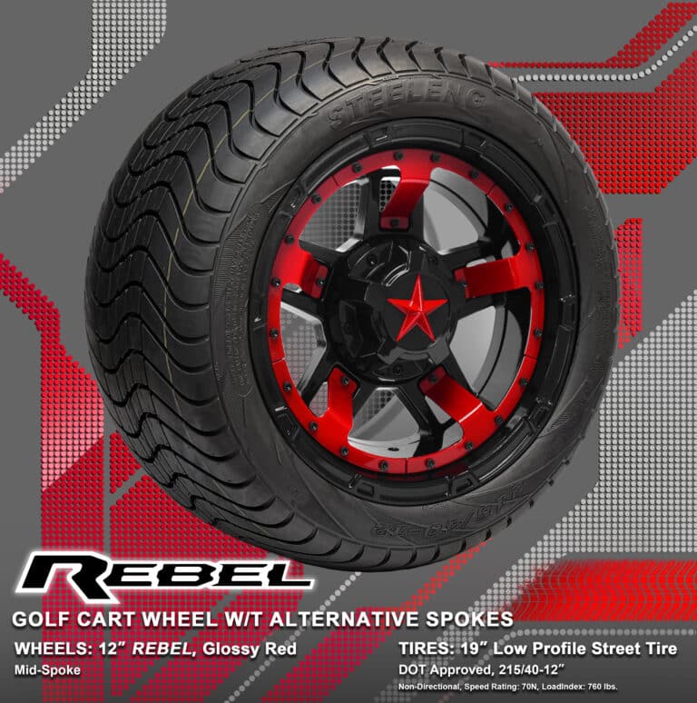 BNDL-TR1211-WH1251-WIRB08-LN0002 – SGC 12″ REBEL Glossy Black Wheel – Aluminum Alloy / STEELENG 215/40-12 Low Profile Tire DOT Approved / REBEL Inserts-Mid Spoke-Glossy Red
