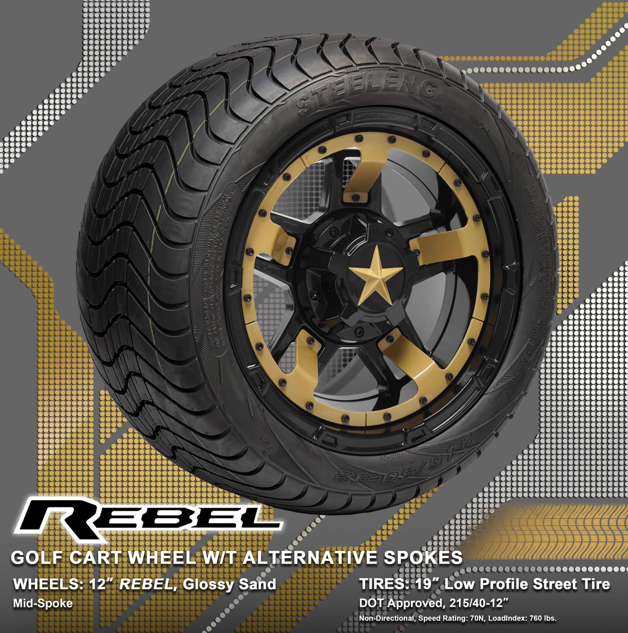 BNDL-TR1211-WH1251-WIRB09-LN0002 – SGC 12″ REBEL Glossy Black Wheel – Aluminum Alloy / STEELENG 215/40-12 Low Profile Tire DOT Approved / REBEL Inserts-Mid Spoke-Glossy Sand