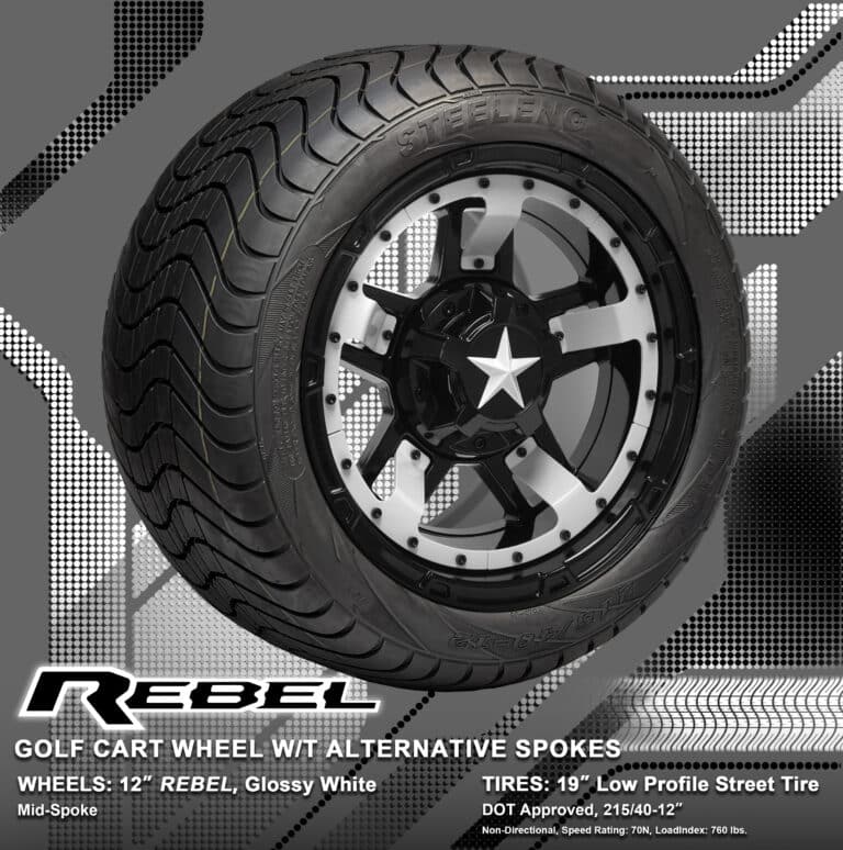 BNDL-TR1211-WH1251-WIRB10-LN0002 – SGC 12″ REBEL Glossy Black Wheel – Aluminum Alloy / STEELENG 215/40-12 Low Profile Tire DOT Approved / REBEL Inserts-Mid Spoke-Glossy White