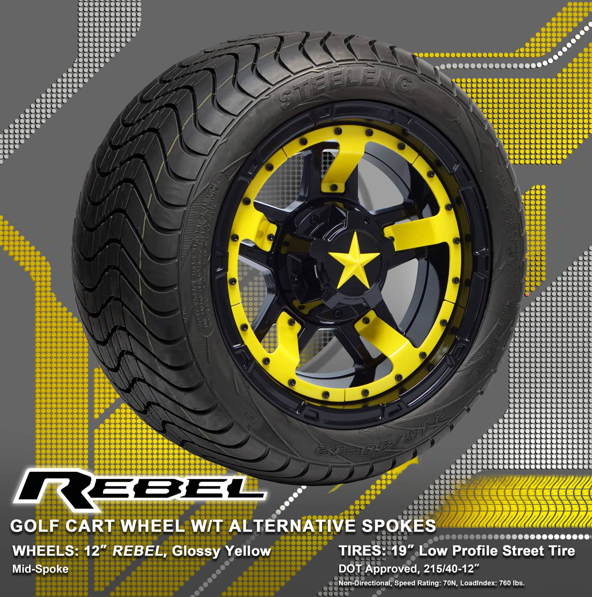 BNDL-TR1211-WH1251-WIRB11-LN0002 – SGC 12″ REBEL Glossy Black Wheel – Aluminum Alloy / STEELENG 215/40-12 Low Profile Tire DOT Approved / REBEL Inserts-Mid Spoke-Glossy Yellow