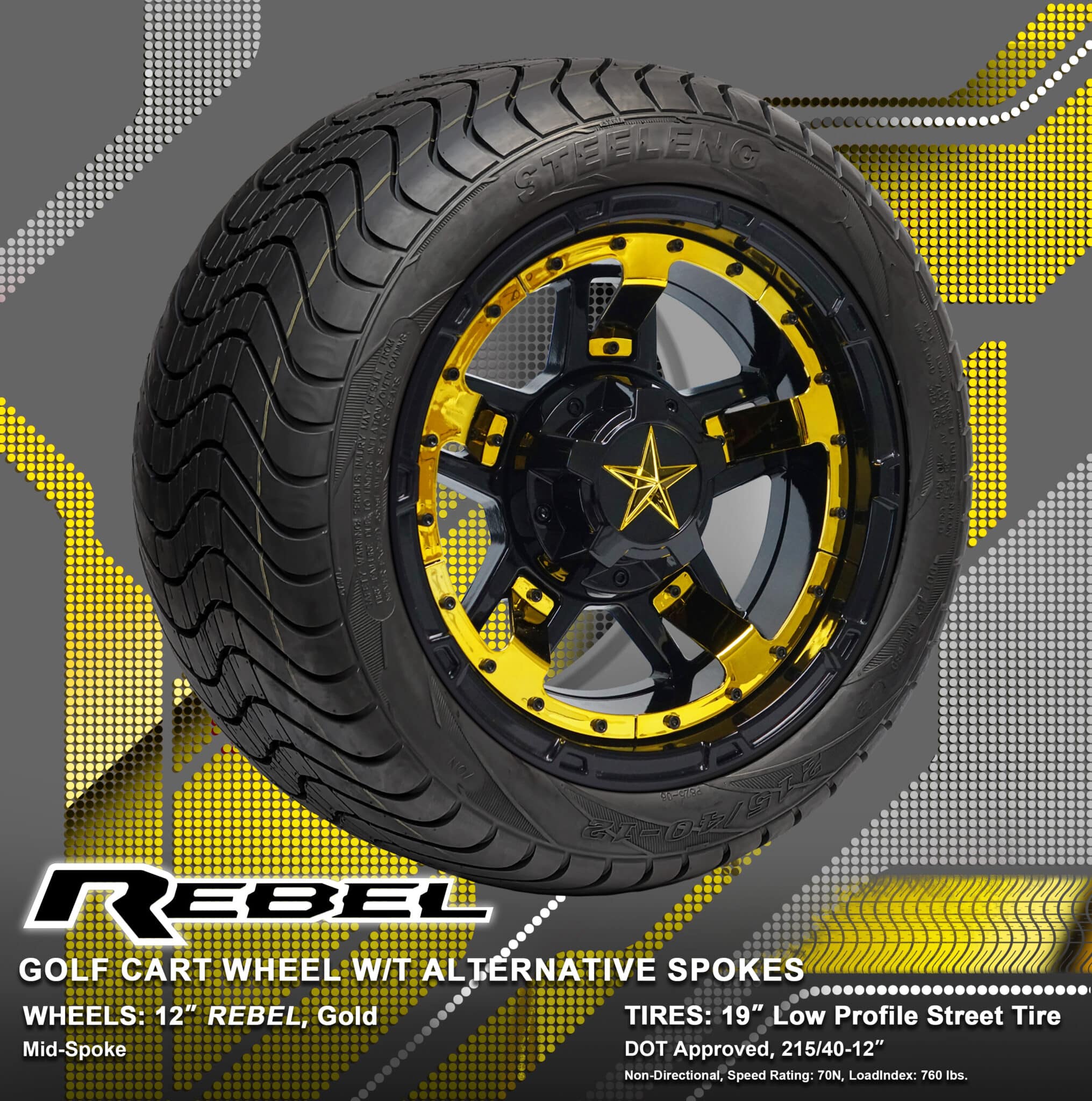 BNDL-TR1211-WH1251-WIRB12-LN0002 – SGC 12″ REBEL Glossy Black Wheel – Aluminum Alloy / STEELENG 215/40-12 Low Profile Tire DOT Approved / REBEL Inserts-Mid Spoke-Gold