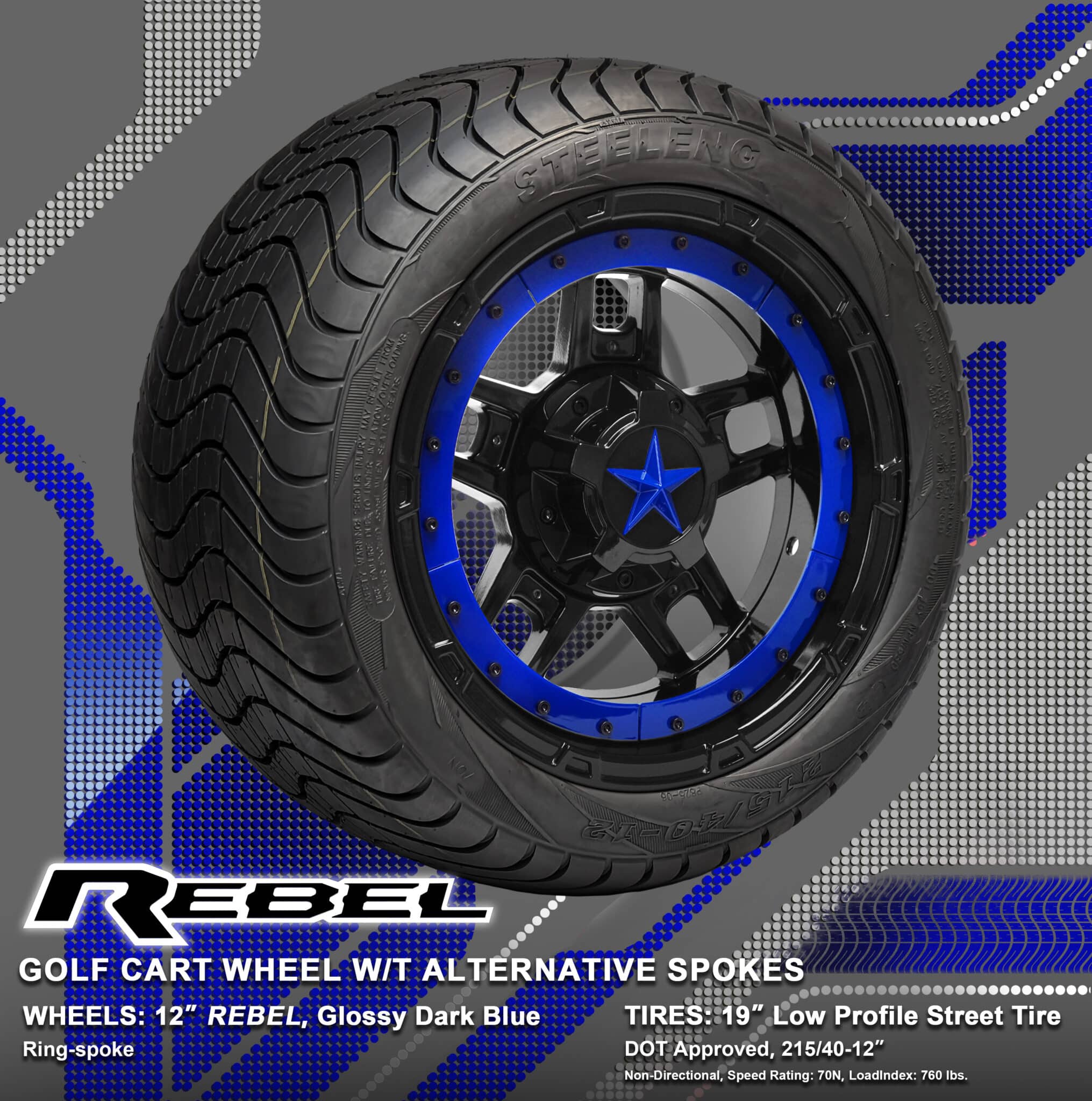 BNDL-TR1211-WH1251-WIRB17-LN0002 – SGC 12″ REBEL Glossy Black Wheel – Aluminum Alloy / STEELENG 215/40-12 Low Profile Tire DOT Approved / REBEL Inserts-Ring-Glossy Dark Blue