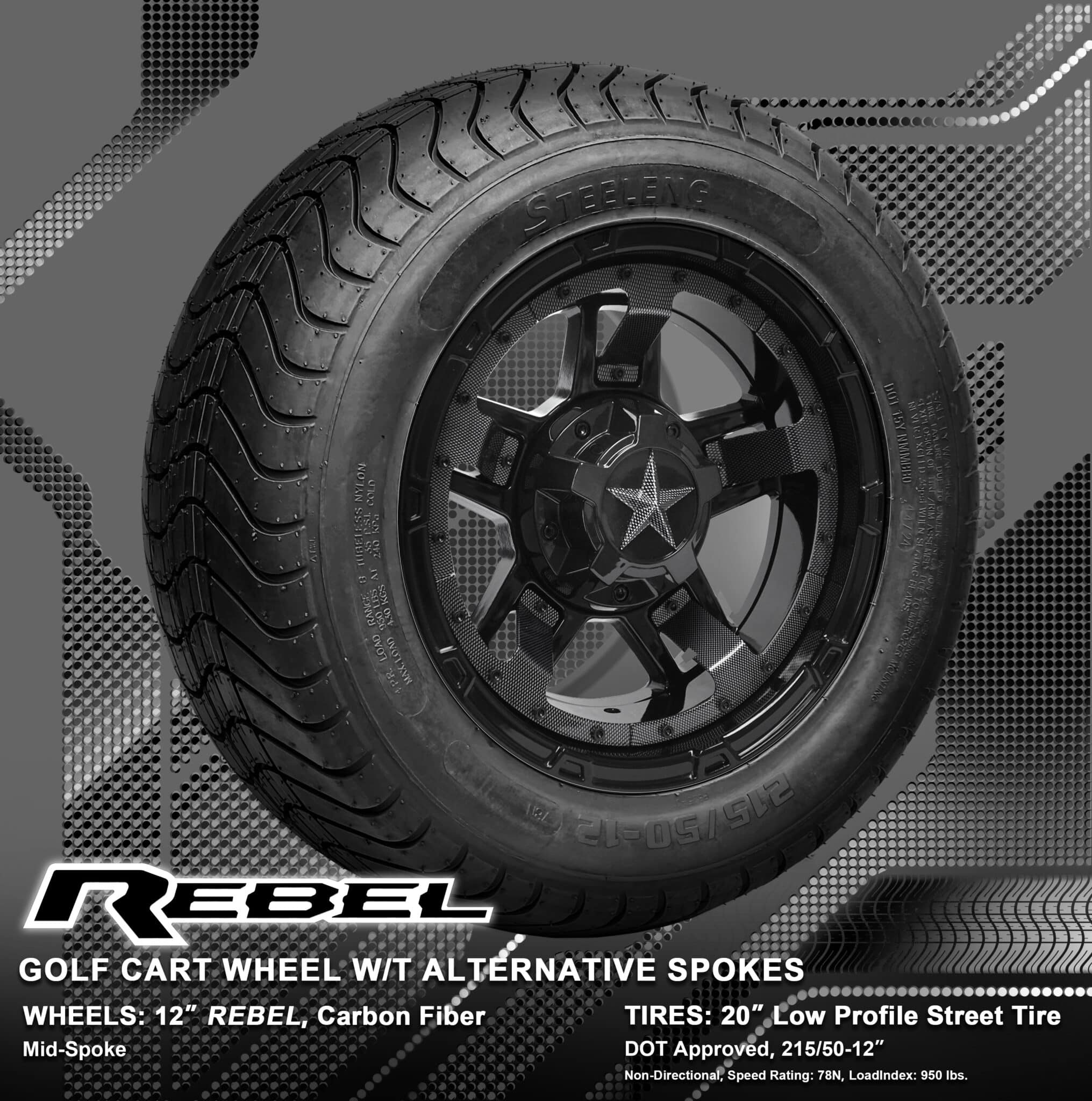 BNDL-TR1213-WH1251-WIRB01-LN0002 – SGC 12″ REBEL Glossy Black Wheel – Aluminum Alloy / STEELENG 215/50-12 Comfort Ride Street Tire DOT Approved / REBEL Inserts-Mid Spoke-Carbon Fiber