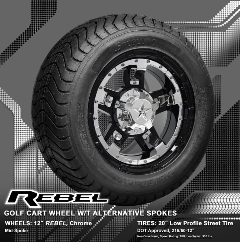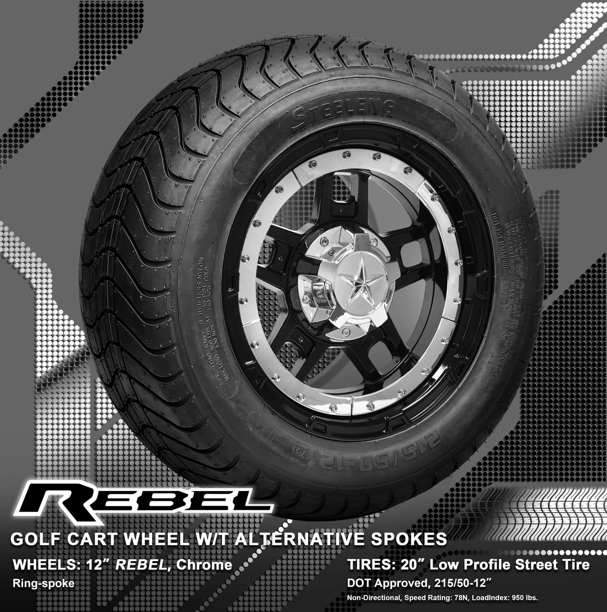 BNDL-TR1213-WH1251-WIRB02-LN0002 – SGC 12″ REBEL Glossy Black Wheel – Aluminum Alloy / STEELENG 215/50-12 Comfort Ride Street Tire DOT Approved / REBEL Inserts-Mid Spoke-Chrome