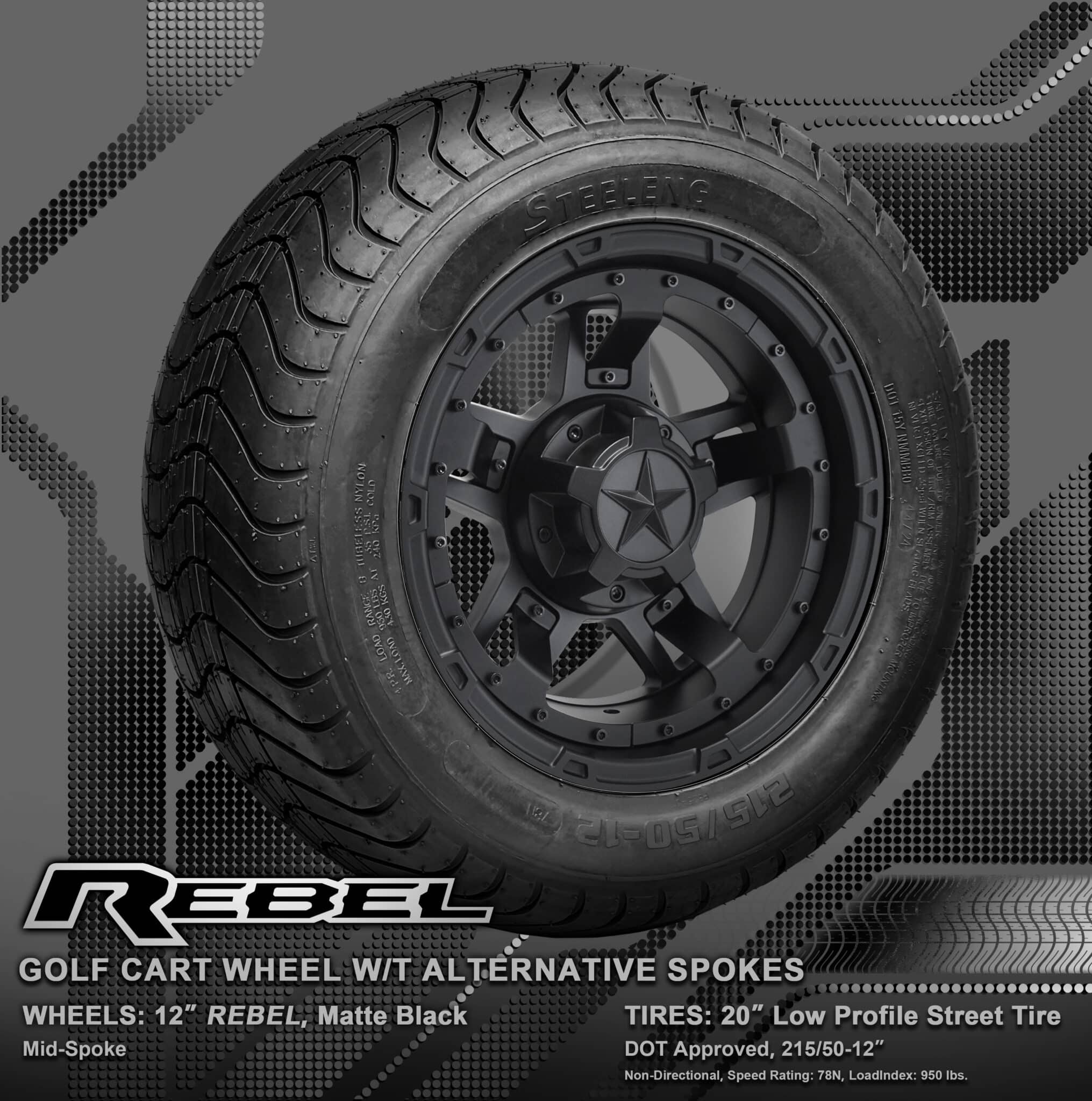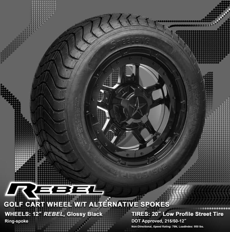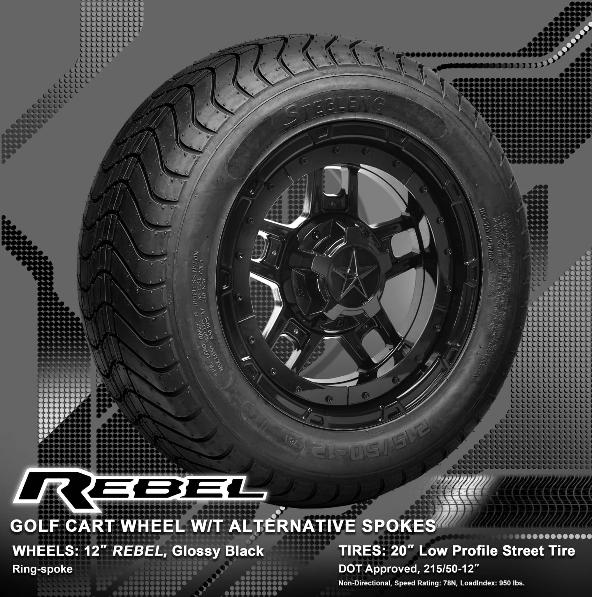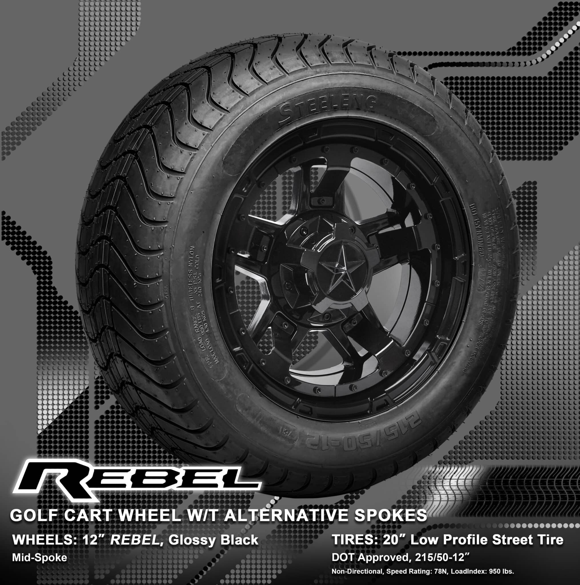 BNDL-TR1213-WH1251-WIRB13-LN0002 – SGC 12″ REBEL Glossy Black Wheel – Aluminum Alloy / STEELENG 215/50-12 Comfort Ride Street Tire DOT Approved / REBEL Inserts-Mid Spoke-Matte Black
