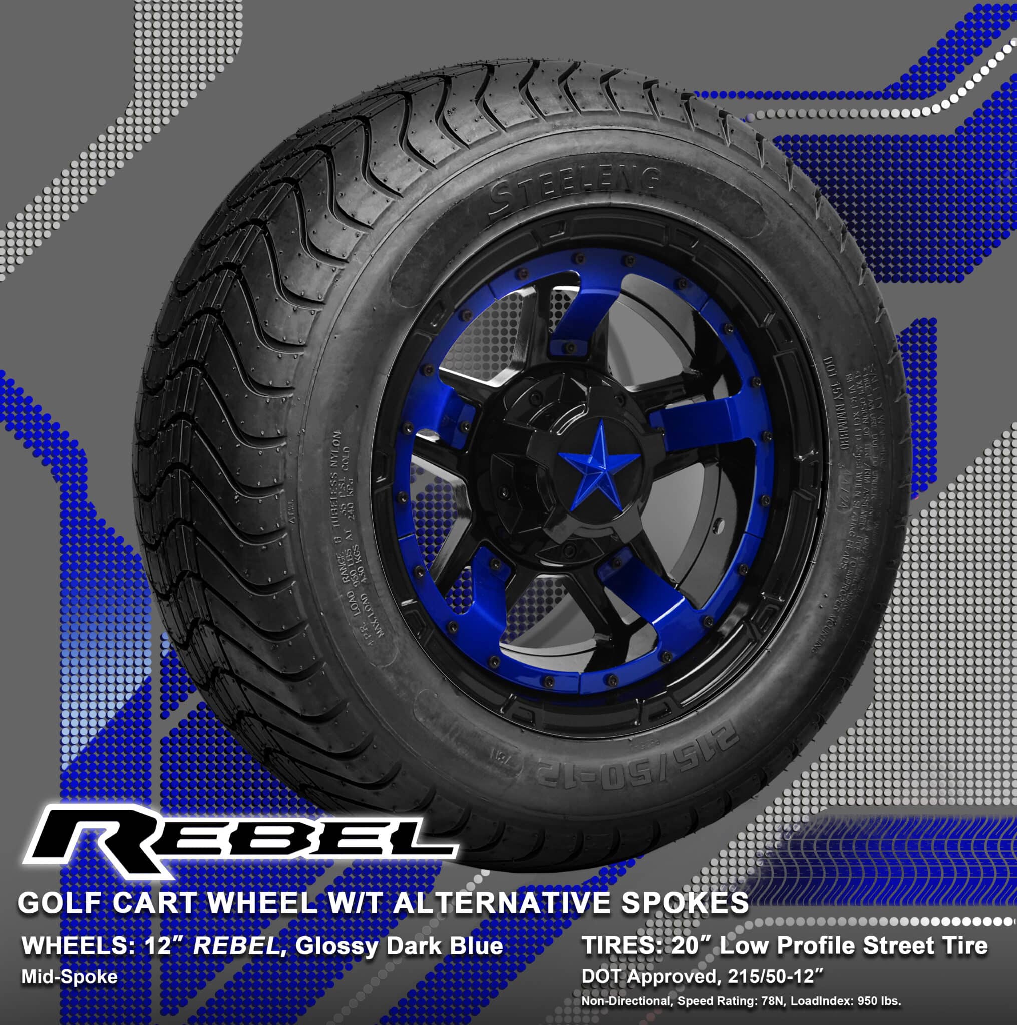 BNDL-TR1213-WH1251-WIRB04-LN0002 – SGC 12″ REBEL Glossy Black Wheel – Aluminum Alloy / STEELENG 215/50-12 Comfort Ride Street Tire DOT Approved / REBEL Inserts-Mid Spoke-Glossy Dark Blue