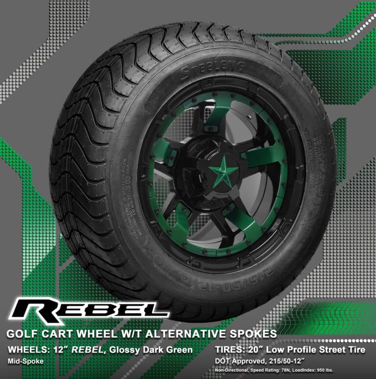 BNDL-TR1213-WH1251-WIRB05-LN0002 – SGC 12″ REBEL Glossy Black Wheel – Aluminum Alloy / STEELENG 215/50-12 Comfort Ride Street Tire DOT Approved / REBEL Inserts-Mid Spoke-Glossy Dark Green