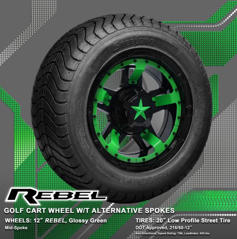 BNDL-TR1213-WH1251-WIRB06-LN0002 – SGC 12″ REBEL Glossy Black Wheel – Aluminum Alloy / STEELENG 215/50-12 Comfort Ride Street Tire DOT Approved / REBEL Inserts-Mid Spoke-Glossy Green