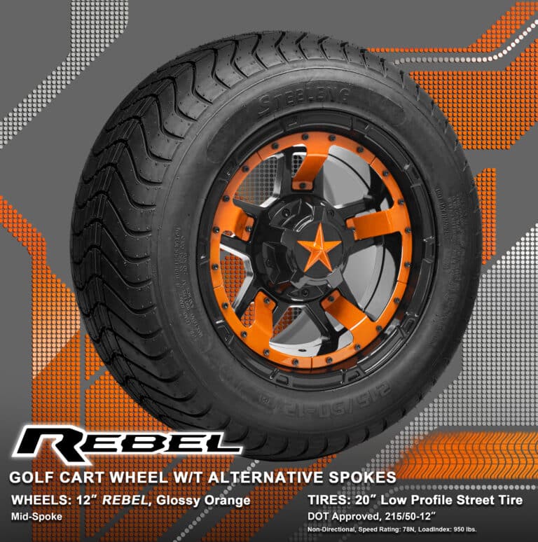 BNDL-TR1213-WH1251-WIRB07-LN0002 – SGC 12″ REBEL Glossy Black Wheel – Aluminum Alloy / STEELENG 215/50-12 Comfort Ride Street Tire DOT Approved / REBEL Inserts-Mid Spoke-Glossy Orange