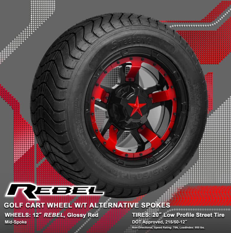 BNDL-TR1213-WH1251-WIRB08-LN0002 – SGC 12″ REBEL Glossy Black Wheel – Aluminum Alloy / STEELENG 215/50-12 Comfort Ride Street Tire DOT Approved / REBEL Inserts-Mid Spoke-Glossy Red