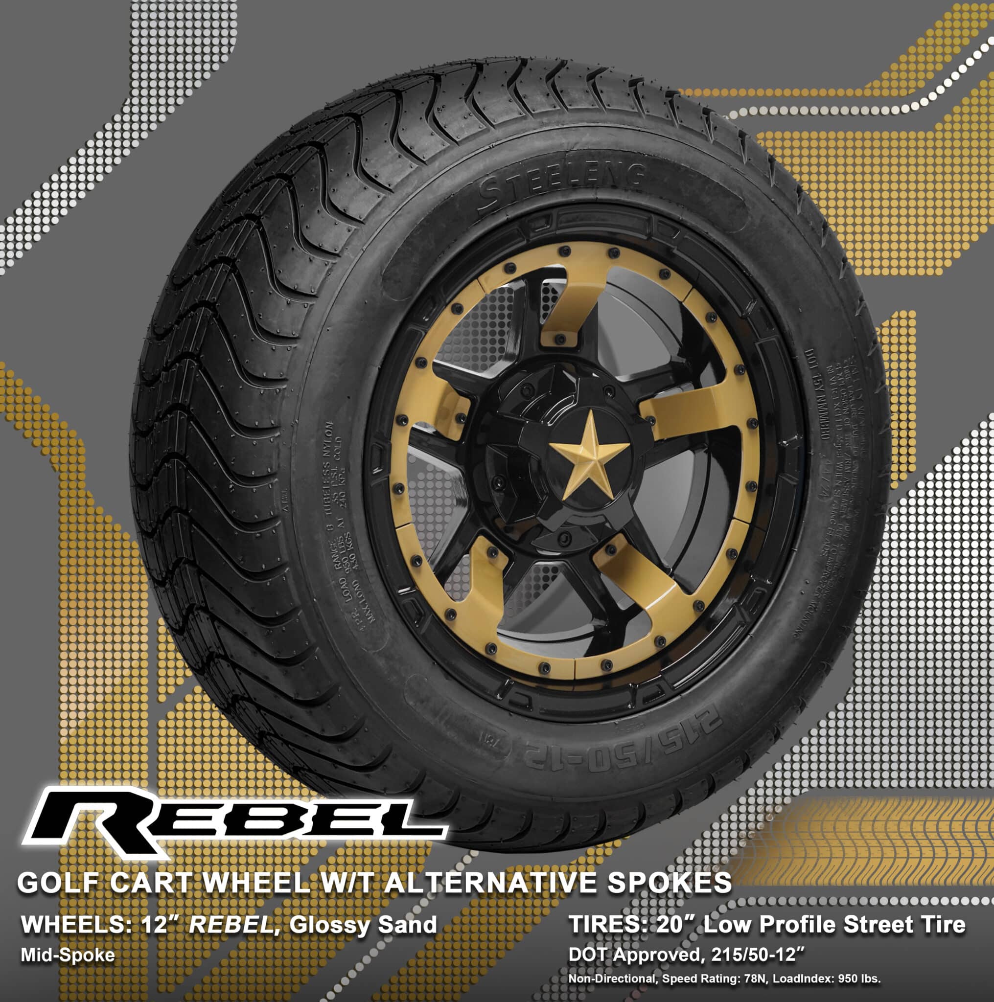 BNDL-TR1213-WH1251-WIRB09-LN0002 – SGC 12″ REBEL Glossy Black Wheel – Aluminum Alloy / STEELENG 215/50-12 Comfort Ride Street Tire DOT Approved / REBEL Inserts-Mid Spoke-Glossy Sand