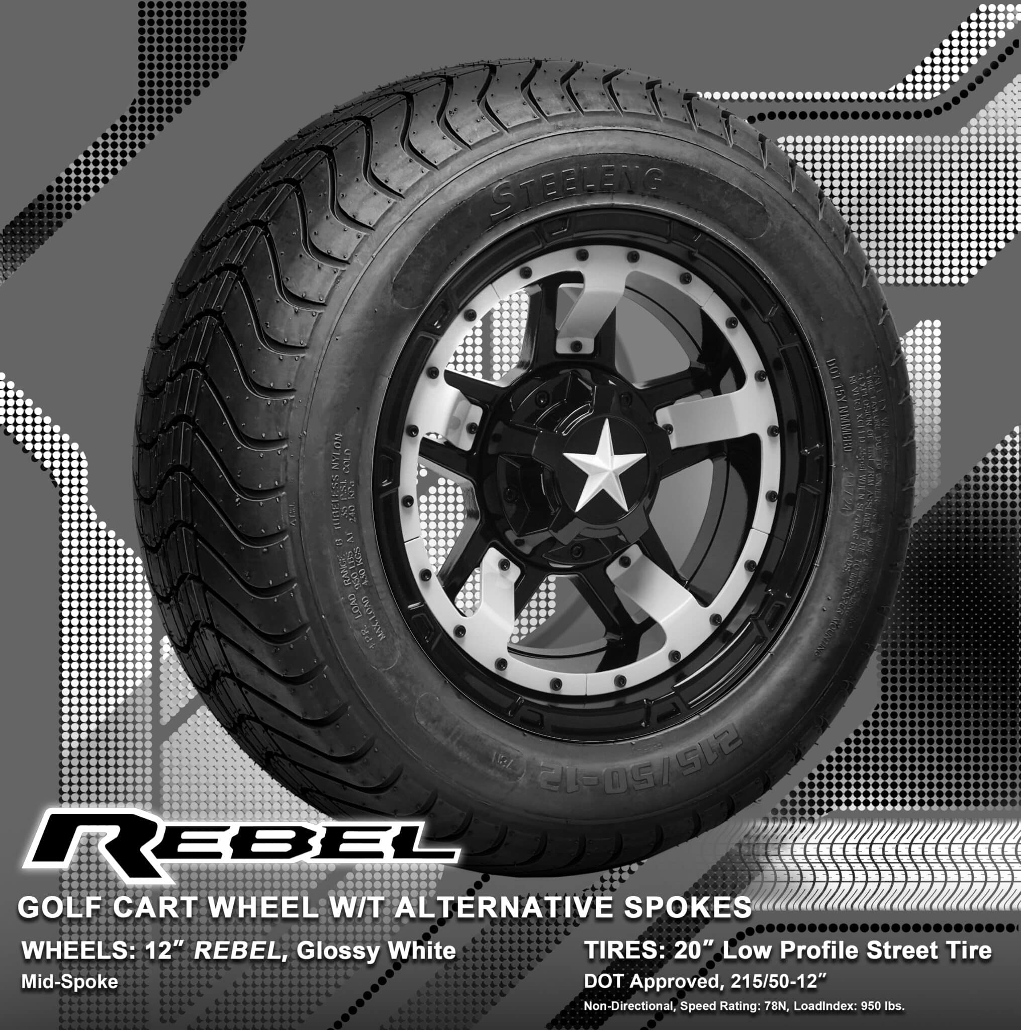 BNDL-TR1213-WH1251-WIRB10-LN0002 – SGC 12″ REBEL Glossy Black Wheel – Aluminum Alloy / STEELENG 215/50-12 Comfort Ride Street Tire DOT Approved / REBEL Inserts-Mid Spoke-Glossy White