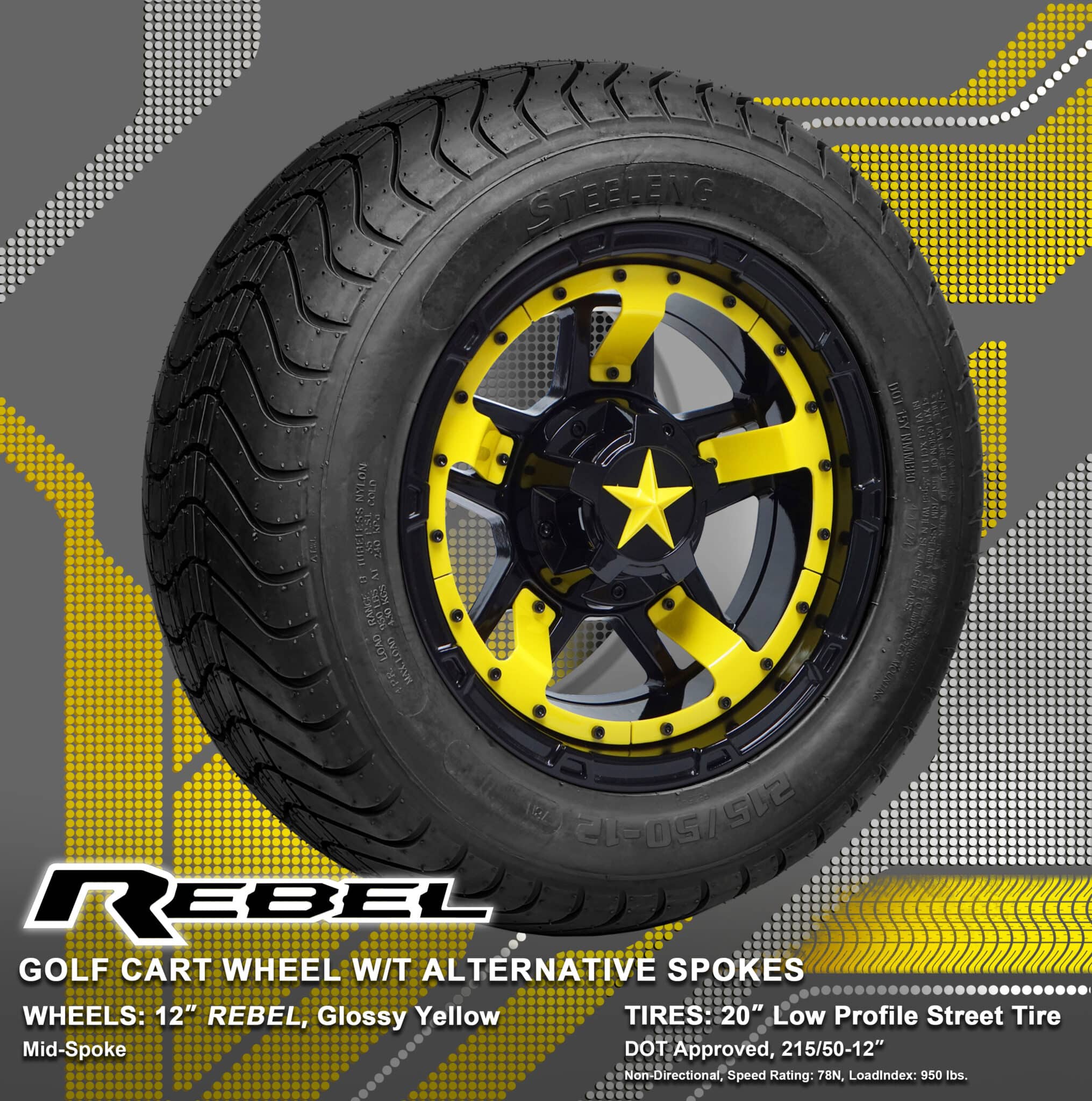 BNDL-TR1213-WH1251-WIRB11-LN0002 – SGC 12″ REBEL Glossy Black Wheel – Aluminum Alloy / STEELENG 215/50-12 Comfort Ride Street Tire DOT Approved / REBEL Inserts-Mid Spoke-Glossy Yellow