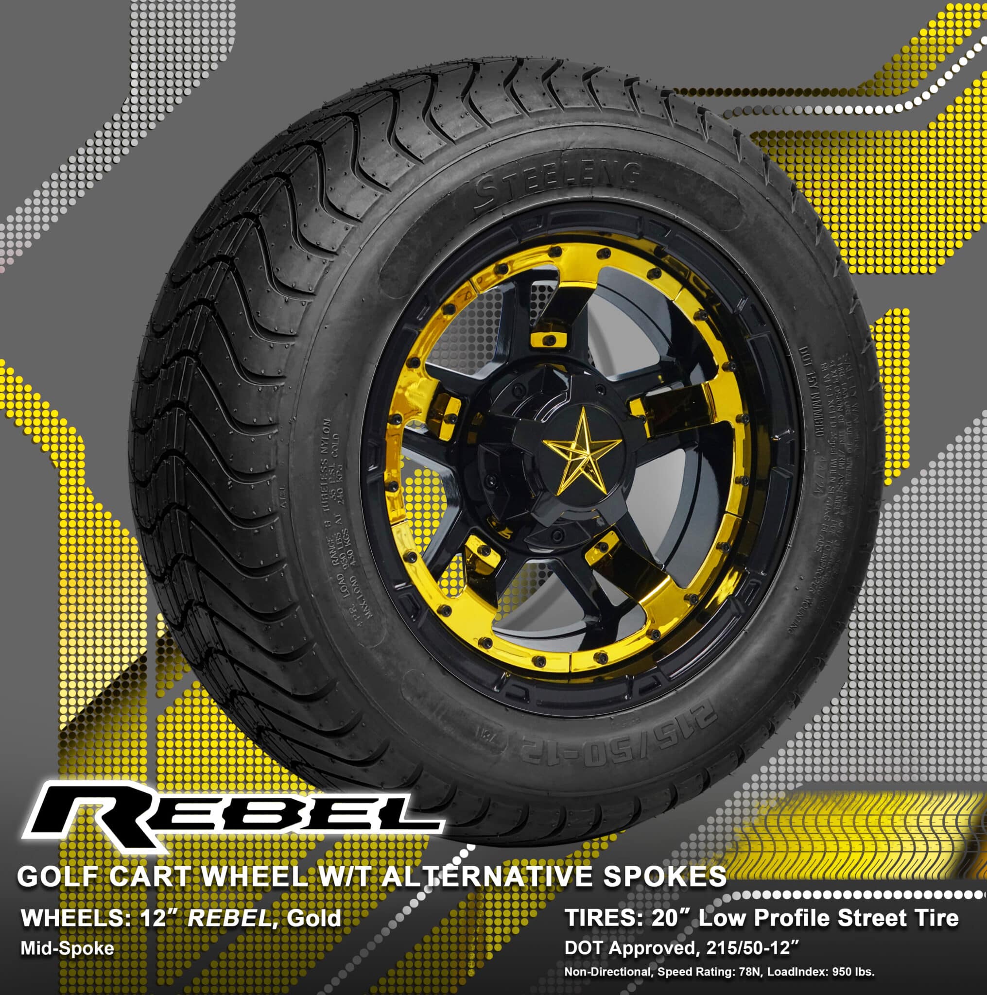 BNDL-TR1213-WH1251-WIRB12-LN0002 – SGC 12″ REBEL Glossy Black Wheel – Aluminum Alloy / STEELENG 215/50-12 Comfort Ride Street Tire DOT Approved / REBEL Inserts-Mid Spoke-Gold