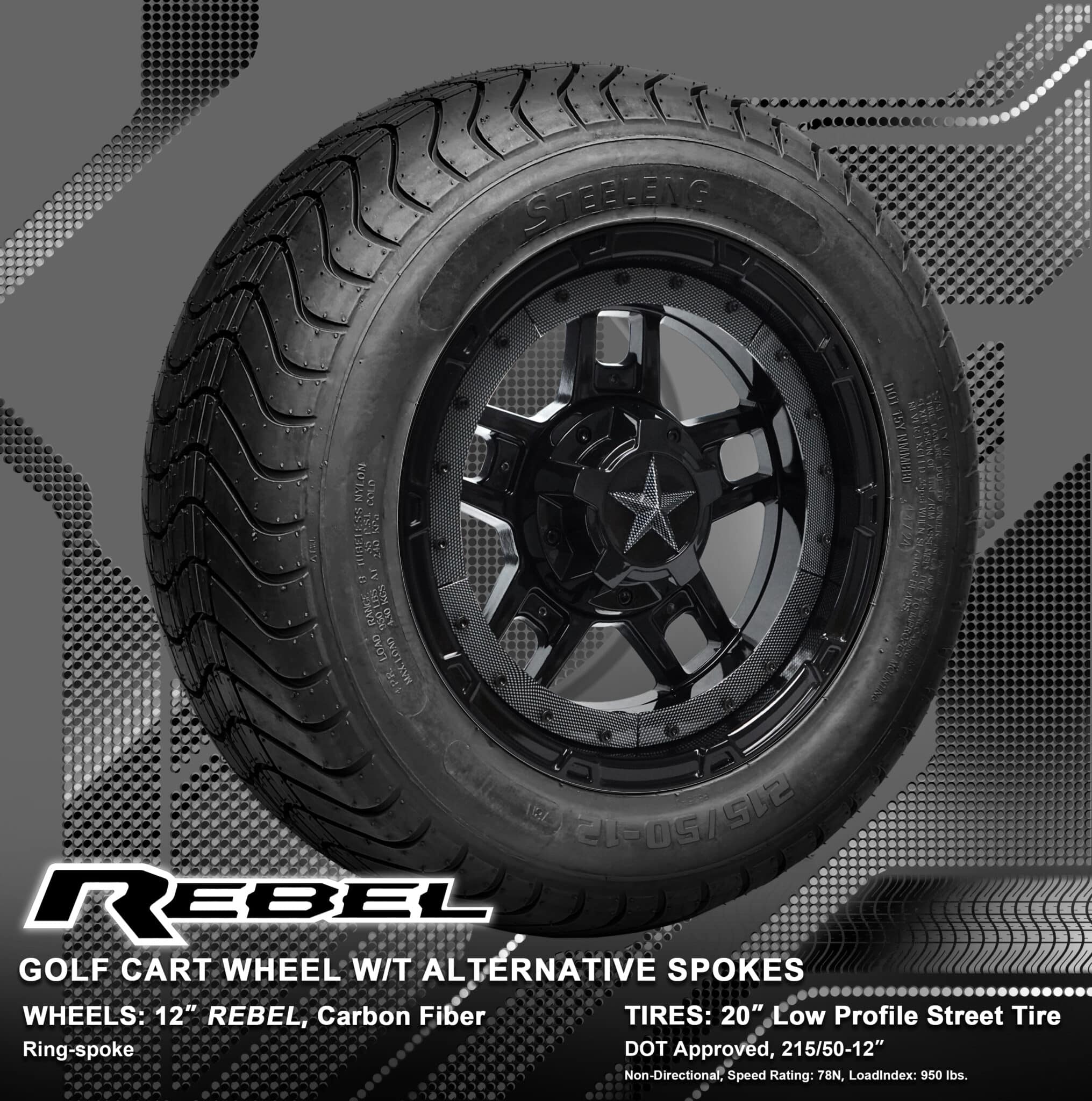 BNDL-TR1213-WH1251-WIRB14-LN0002 – SGC 12″ REBEL Glossy Black Wheel – Aluminum Alloy / STEELENG 215/50-12 Comfort Ride Street Tire DOT Approved / REBEL Inserts-Ring-Carbon Fiber