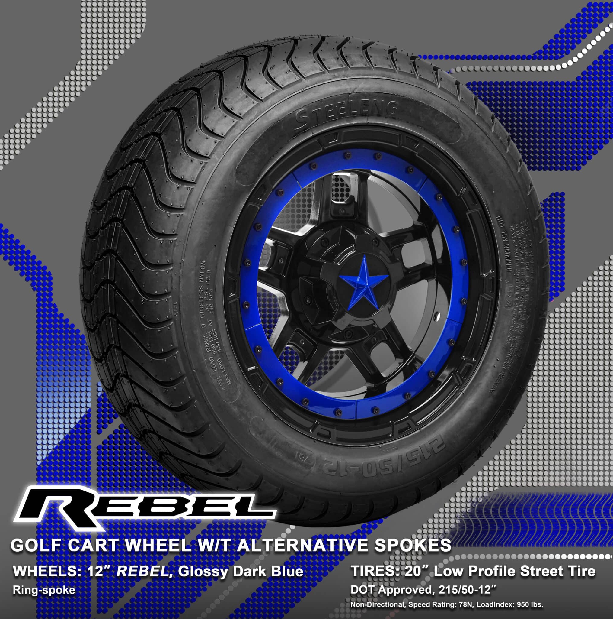 BNDL-TR1213-WH1251-WIRB17-LN0002 – SGC 12″ REBEL Glossy Black Wheel – Aluminum Alloy / STEELENG 215/50-12 Comfort Ride Street Tire DOT Approved / REBEL Inserts-Ring-Glossy Dark Blue
