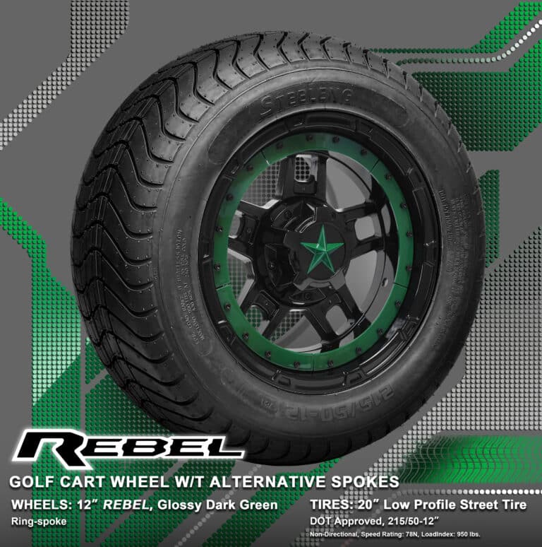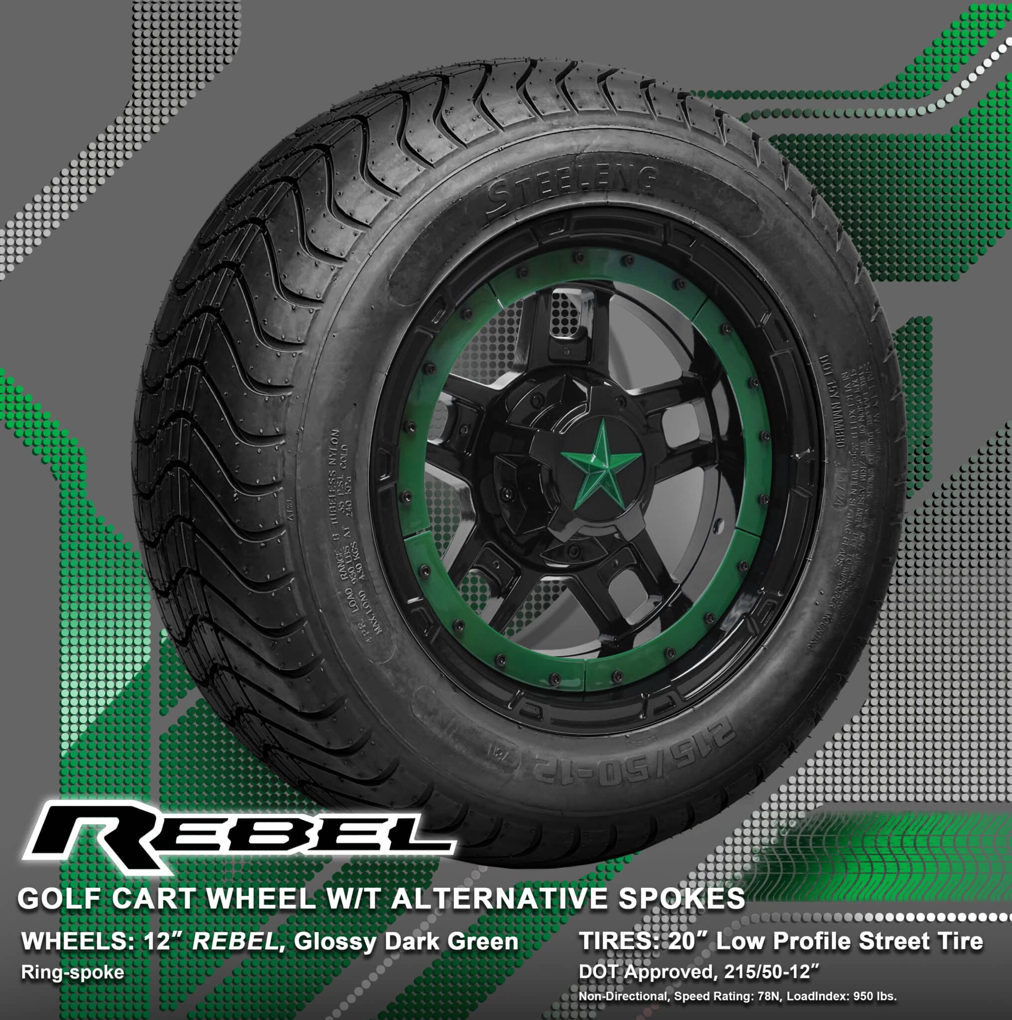BNDL-TR1213-WH1251-WIRB18-LN0002 – SGC 12″ REBEL Glossy Black Wheel – Aluminum Alloy / STEELENG 215/50-12 Comfort Ride Street Tire DOT Approved / REBEL Inserts-Ring-Glossy Dark Green
