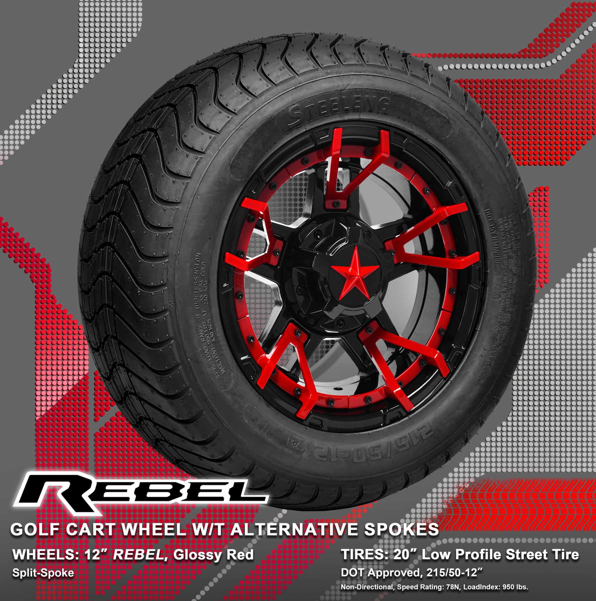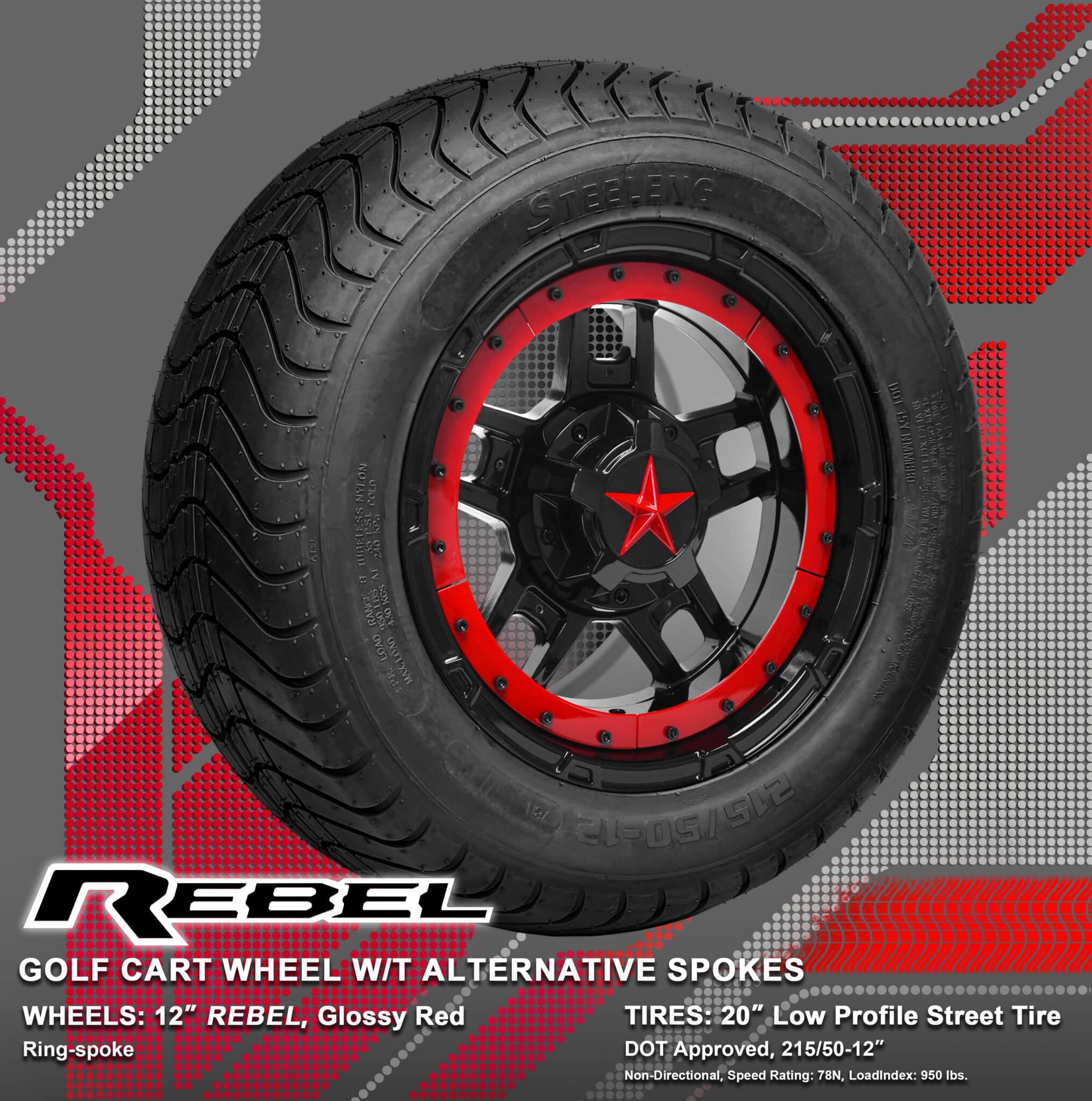 BNDL-TR1213-WH1251-WIRB34-LN0002 – SGC 12″ REBEL Glossy Black Wheel – Aluminum Alloy / STEELENG 215/50-12 Comfort Ride Street Tire DOT Approved / REBEL Inserts-Split Spoke-Glossy Red