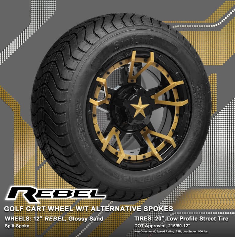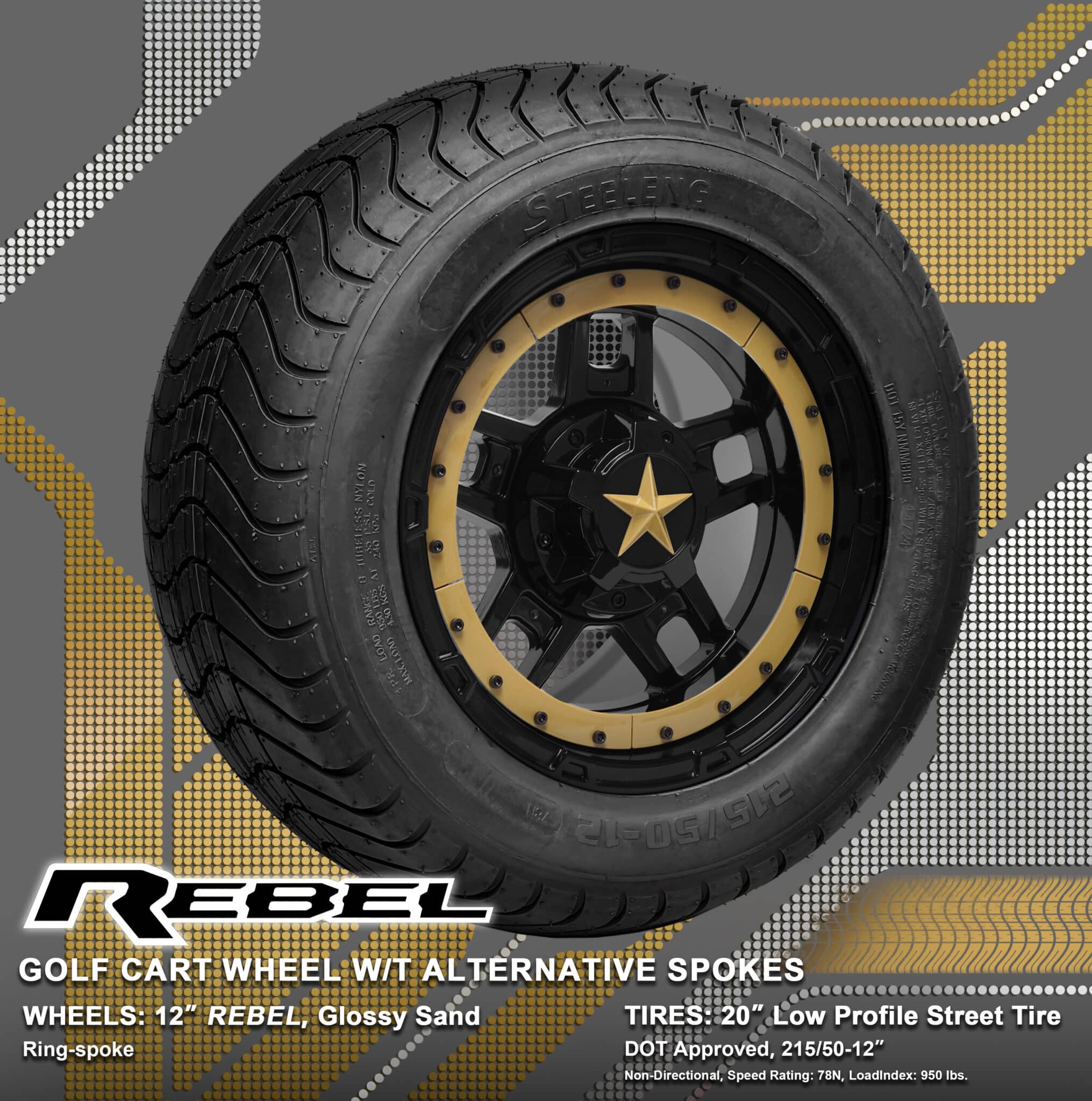 BNDL-TR1213-WH1251-WIRB35-LN0002 – SGC 12″ REBEL Glossy Black Wheel – Aluminum Alloy / STEELENG 215/50-12 Comfort Ride Street Tire DOT Approved / REBEL Inserts-Split Spoke-Glossy Sand