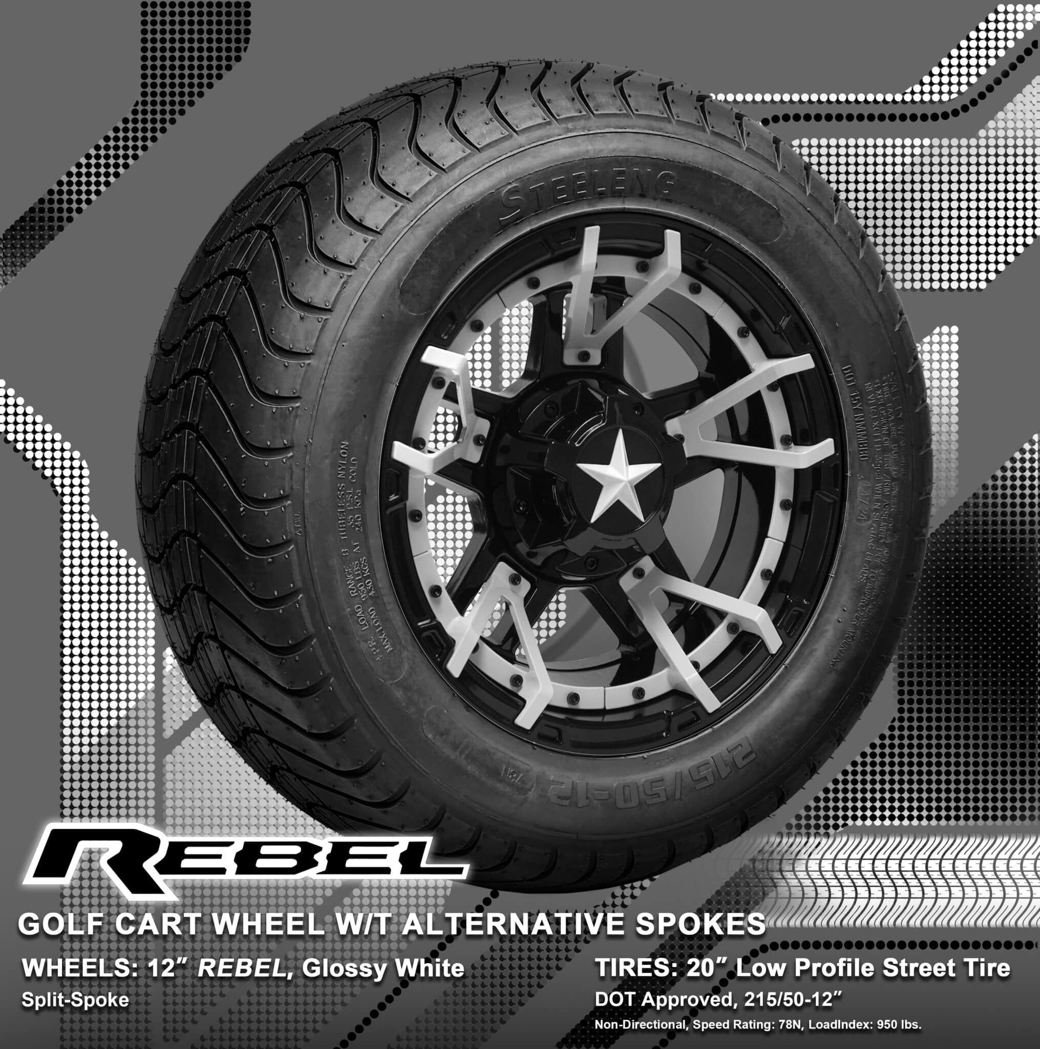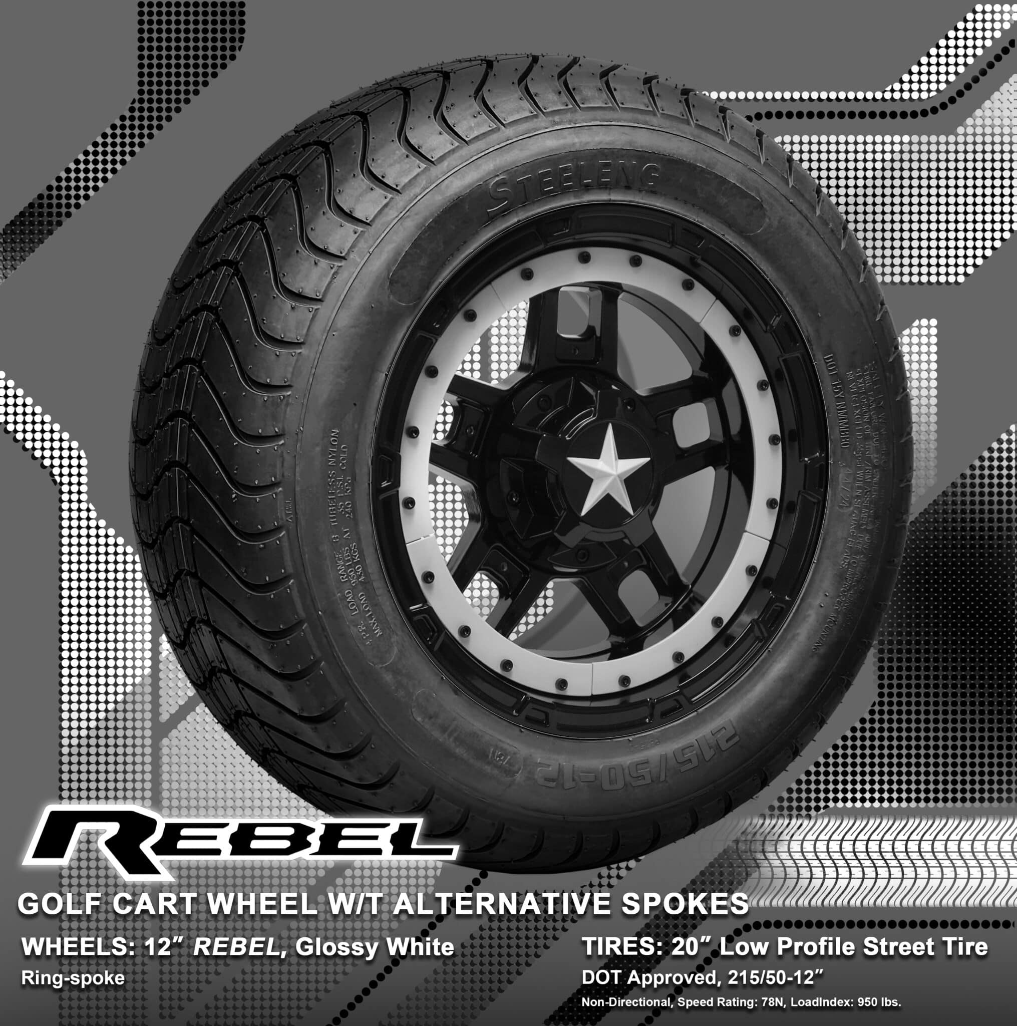 BNDL-TR1213-WH1251-WIRB36-LN0002 – SGC 12″ REBEL Glossy Black Wheel – Aluminum Alloy / STEELENG 215/50-12 Comfort Ride Street Tire DOT Approved / REBEL Inserts-Split Spoke-Glossy White